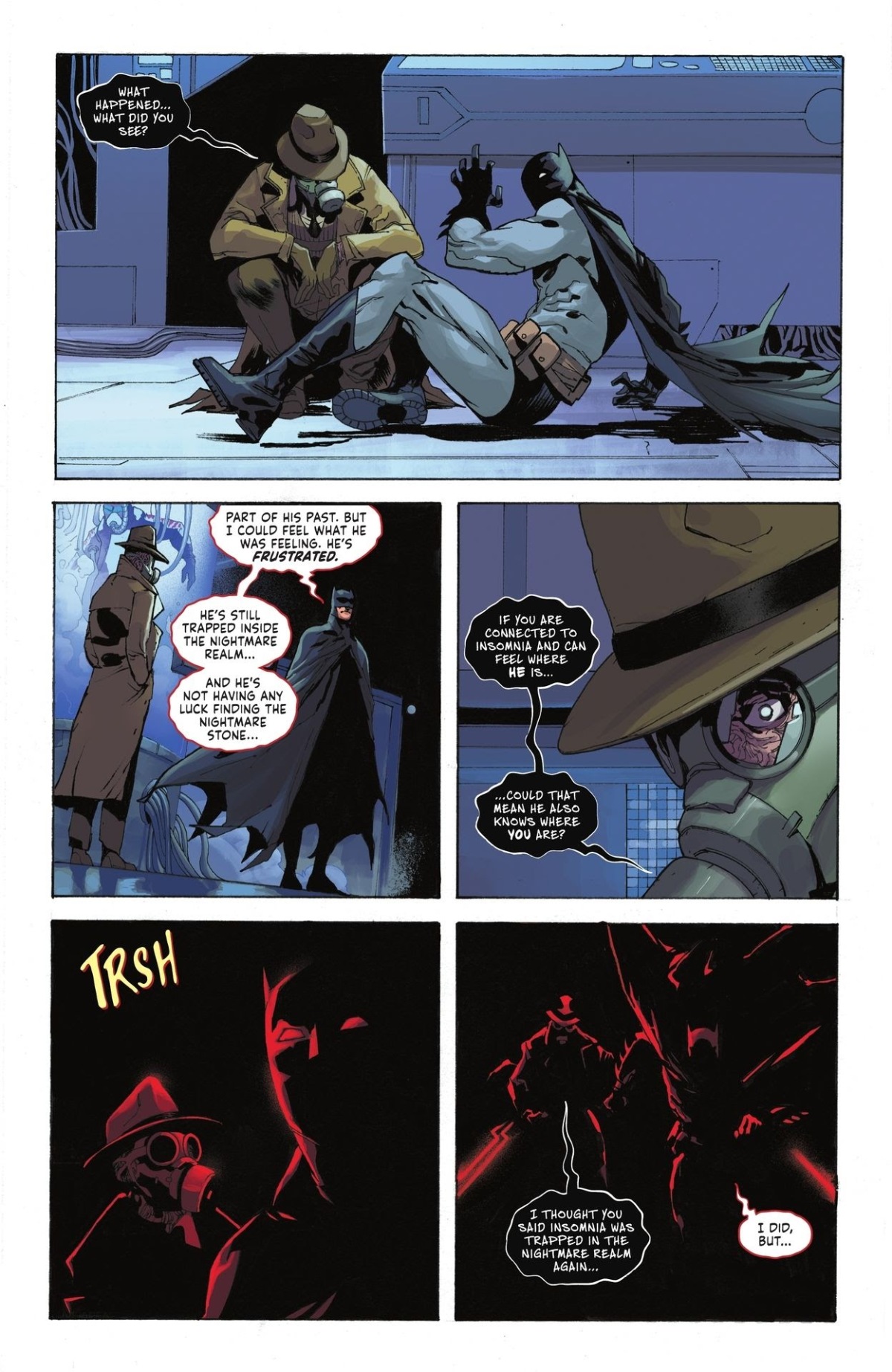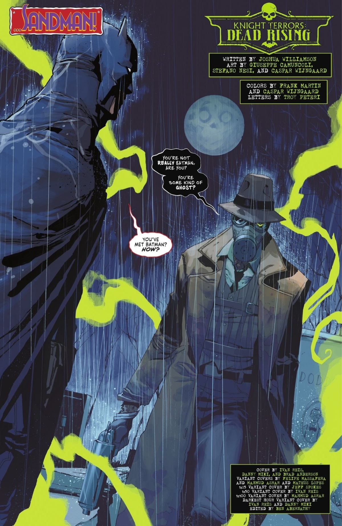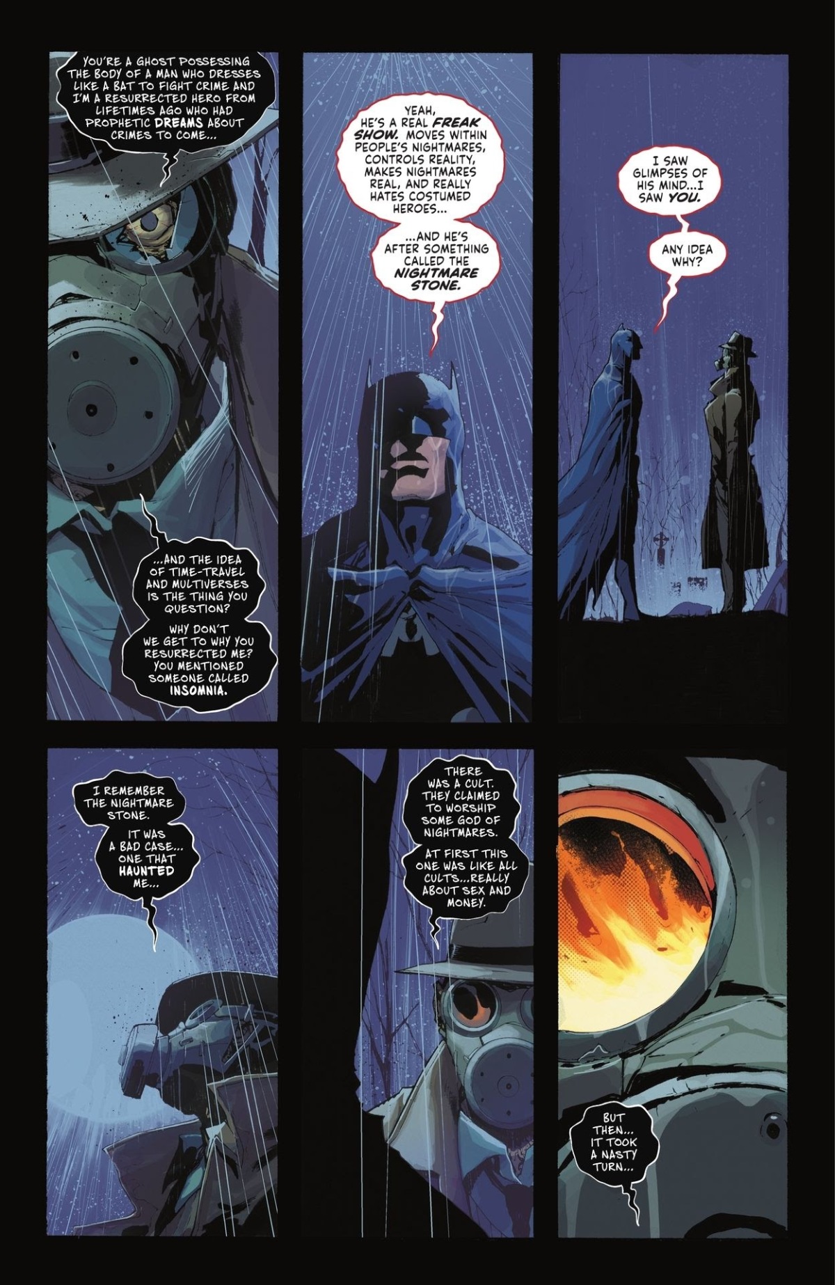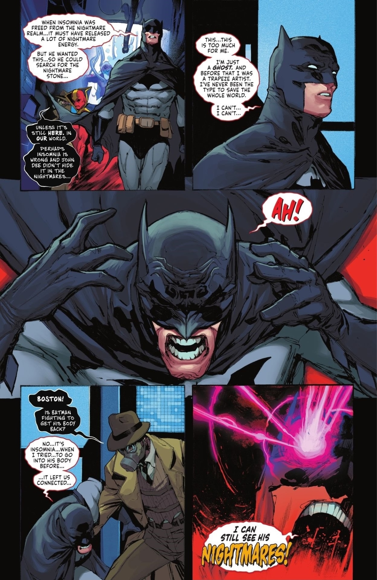 上回,我們說到「失眠(Insomnia)」成功將DC宇宙送入了惡夢之中,以尋找他的目標物「惡夢之石(Nightmare Stone)」;只有一小部分的英雄們成功避免自己也陷入沉睡,正十萬火急地到處救難;而故事的主角,附身在蝙蝠俠的身體上行動的死亡英雄「死人(Deadman)」剛剛喚醒了另一位作古的黃金時代英雄,美國正義協會的「睡魔(Sandman)」!