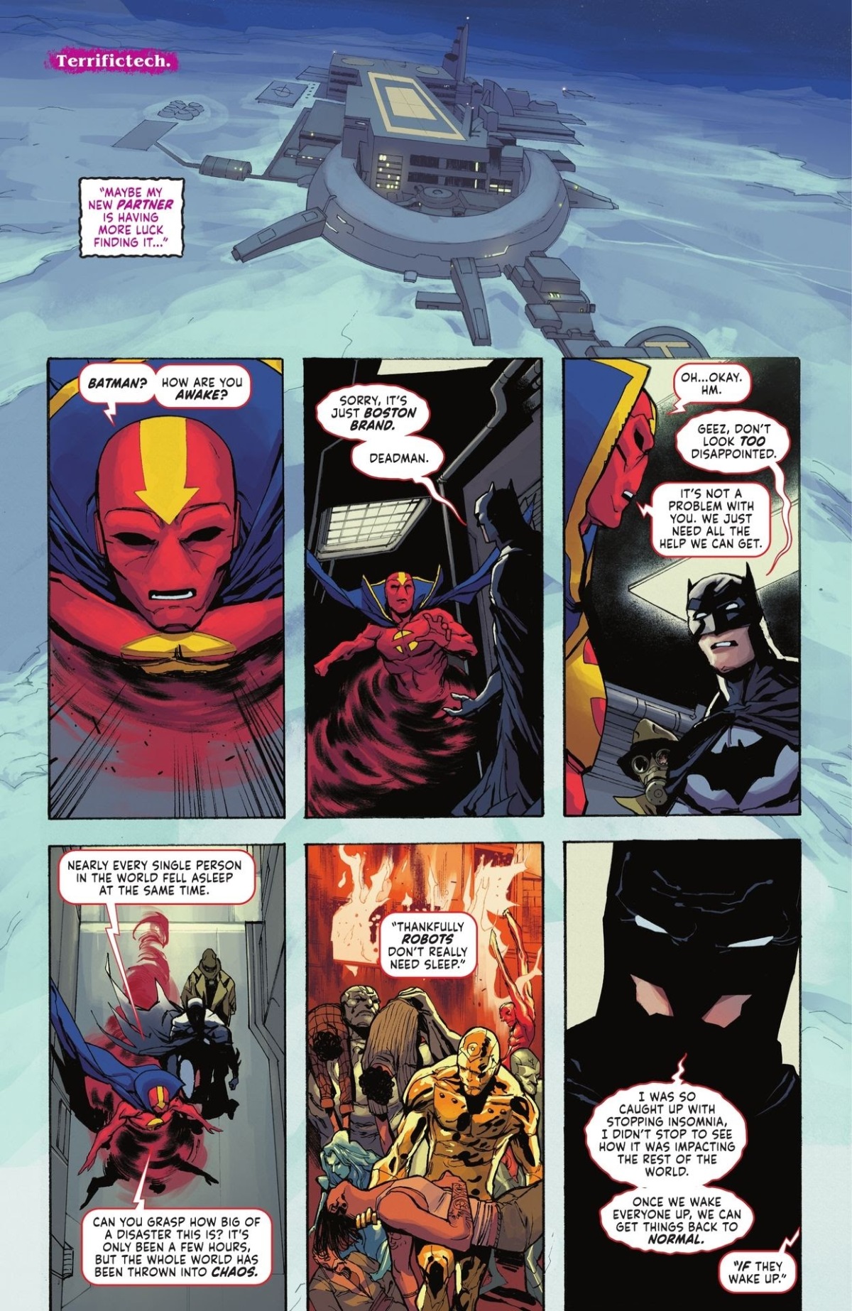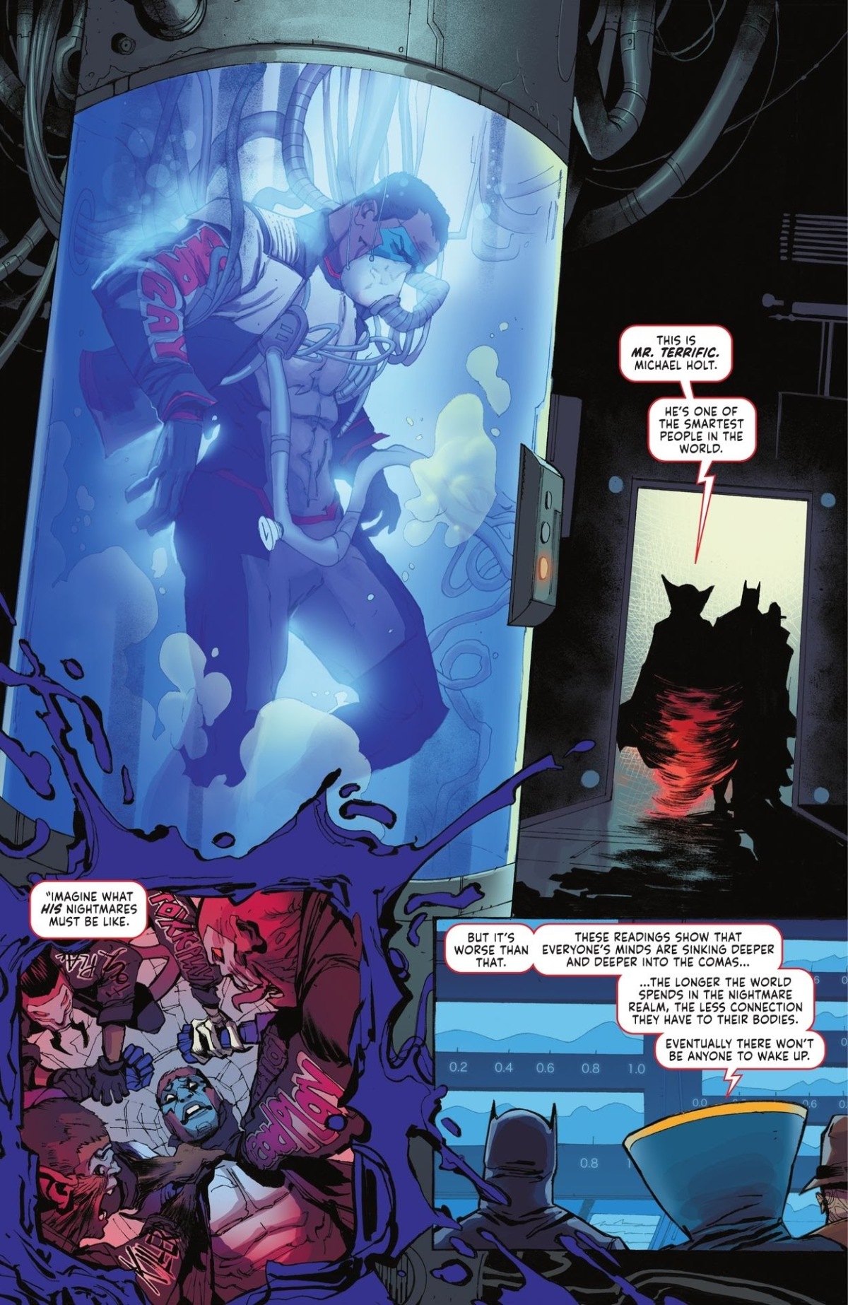 卓越先生(Mr. Terrific)本人即使天縱英明,也沒得逃過這場噩夢。而根據他們的分析,要是他們沒能來得及結束這起事件,全世界的所有人都會永遠醒不來。
