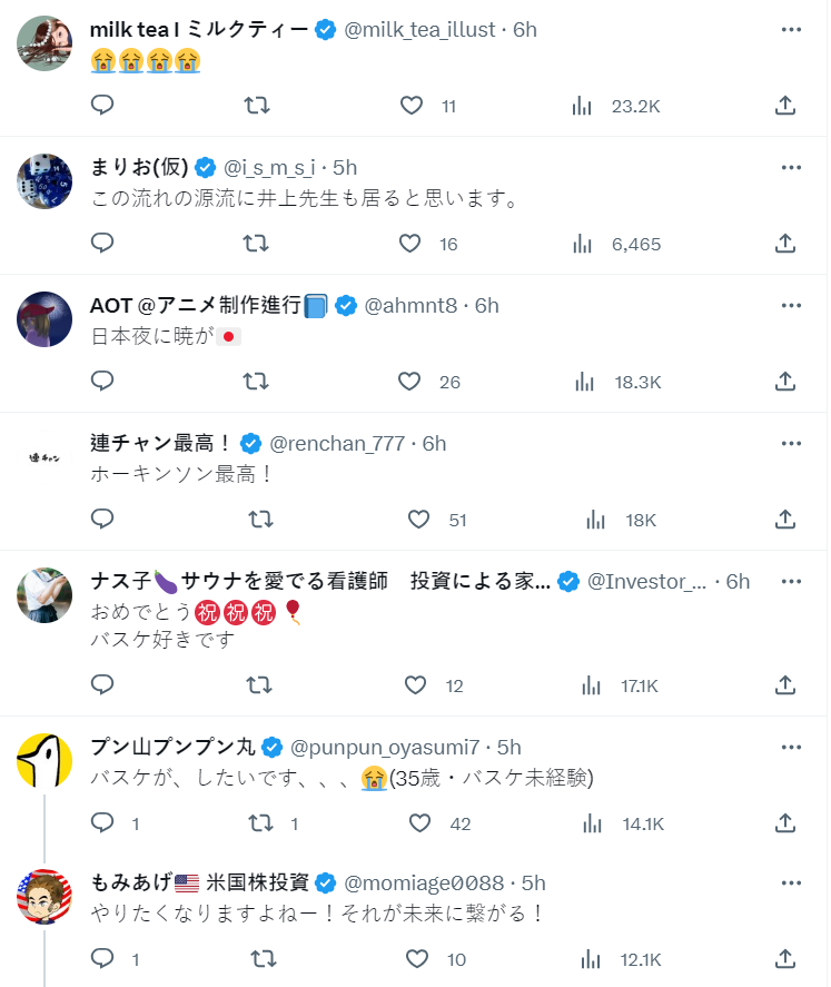 當然還是要 Cue 到井上雄彥老師,賽後井上也在 X 上貼出了璀璨煙火的影片,足以見得井上老師對籃球的熱愛,底下網友也熱情與老師一同慶祝這次的勝利,日本男籃終於有機會自力踏上奧運舞台。