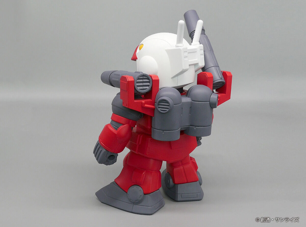 「巨無霸軟膠模型 RX-77‐2 鋼加農 -SD鋼彈-」擁有全高約 22 公分的魄力尺寸,透過數位 3D 模型製作出豐富的裝甲細節,兼具了低頭身的可愛、帥氣的武裝造型。包含頸部、手掌腰部都具備簡易的轉動機構,背包上的兩門加農砲也能夠轉動砲管調整仰角。配件除了手持的光束步槍外,更能將加農砲替換成「噴射導彈發射器」,一次擁有兩種不同規格!