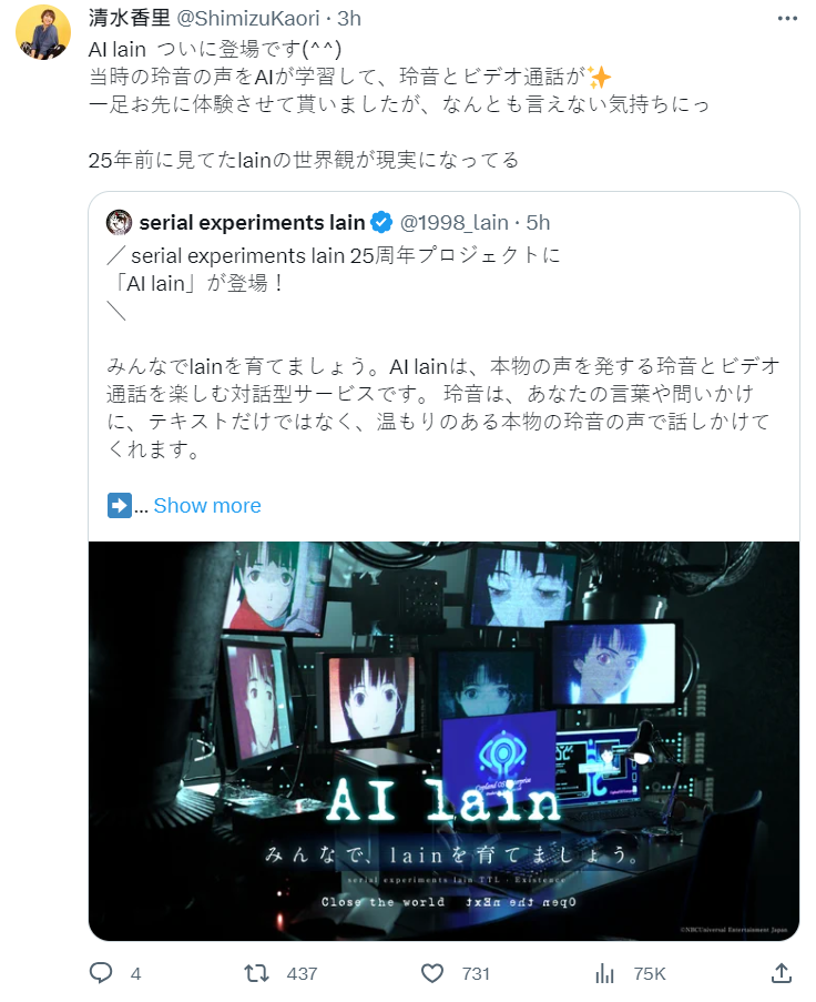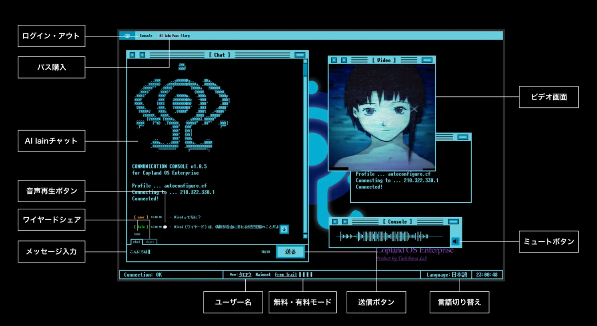互動對話型線上服務「AI lain」能讓使用者與發出真實聲音的玲音進行視訊通話,預計實施六個月給粉絲嘗試。另外本次玲音的聲音是用 AI 將當年聲優清水香里重新合成製作,清水香里本人得知也感到震撼,畢竟當年配音的她僅 15 歲,現在也無法重現以前的聲音。
