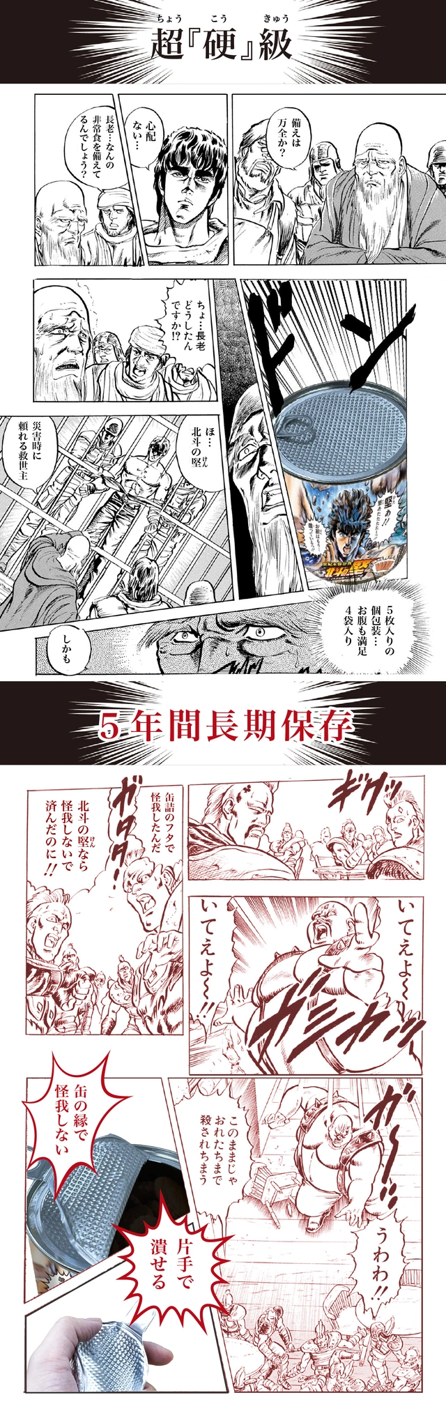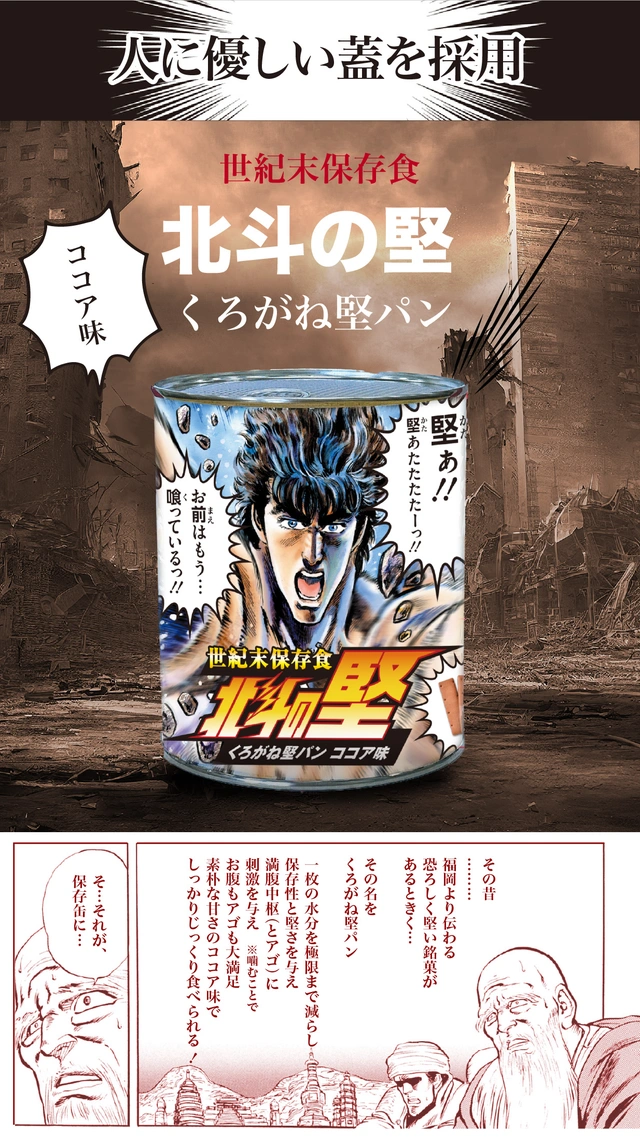 今日 ( 9/5 ) 官方宣布,先前與防災食品開發商「光工業株式会社」的募資企劃-北斗の拳×非常食正式實踐,推出聯名的防災食品「くろがね堅パン」乾糧,陪你度過世紀末的危機,於今日起也在各通路開始販售。