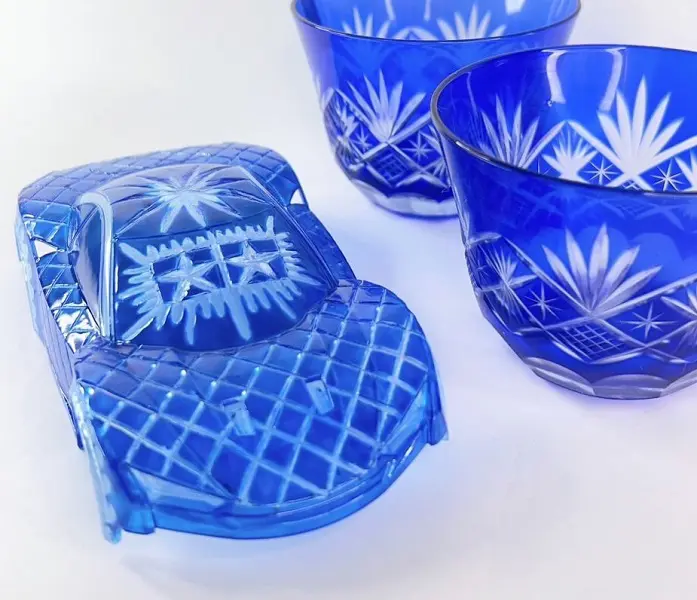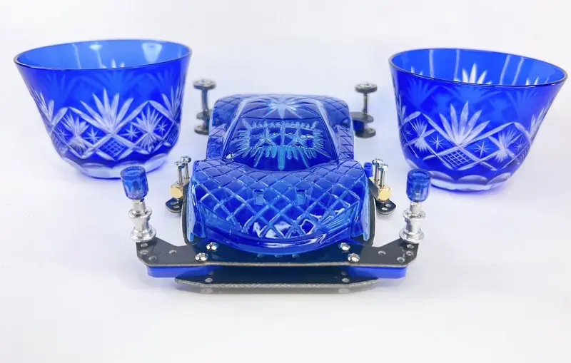 這個「切子玻璃風」四驅車殼,其實是推主用鑿子一個個在塑料車殼上雕刻出來的,透過噴上湛藍色的塗料,讓它跟傳統的「江戶切子」風貌接近。