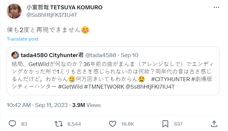 連 TM NETWORK 的靈魂人物小室哲哉也回應該篇文,表示自己也無法再現這首經典歌曲,畢竟這首歌也是該團的代表作,過了這麼多年還有喜歡的人真的感到十分榮幸。