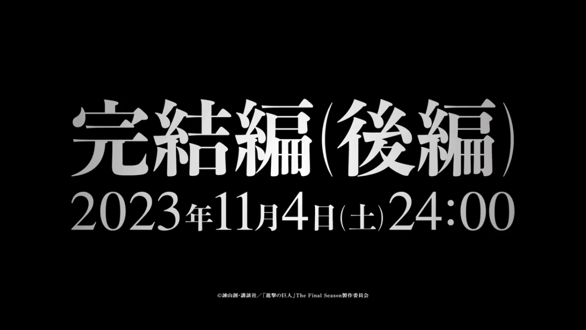 隨著《進擊的巨人 The Final Season 完結篇(前篇)》在2023年3月播放結束後,時隔半年的今天,官方終於正式敲定接下來即將放送的「真.完結篇」《進擊的巨人 The Final Season(後篇)》開播時間,同時也在Twitter上釋出第二支PV預告。