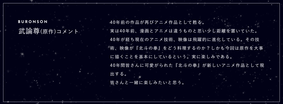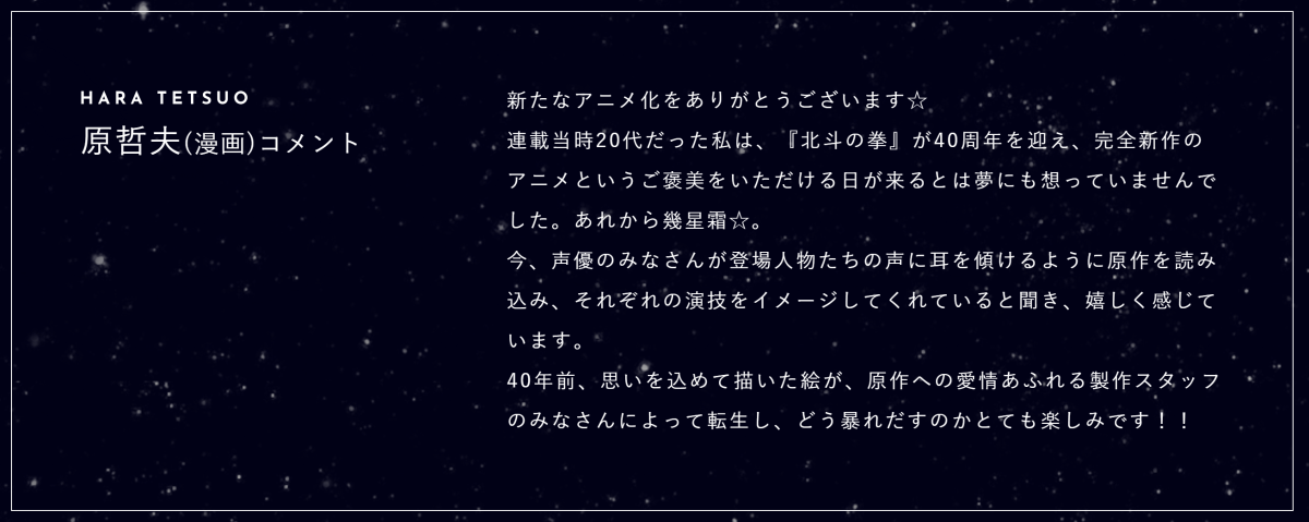 作畫的原哲夫則表示,當初連載自己才 20 幾歲,現在已經 40 年過去了,沒想到這部作品還可以再次以新作動畫的方式呈現給大家。現在聲優與製作團隊都非常認真在閱讀原作,相信演出會給大家新的氣象。