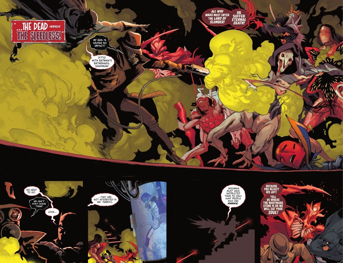 雖然已經過了一段時間,我們還是要把這個故事說完。目前仍是DC宇宙最新的大事件《騎士驚魂》說到了第三期,前面我們看到附身了蝙蝠俠的死人(Deadman)和被暫時復活的黃金時代睡魔(Sandman)來到了卓越企業與紅色龍捲風(Red Tornado)會合,卻發現後者居然也被反派「失眠(Insomnia)」的手下們給入侵了。