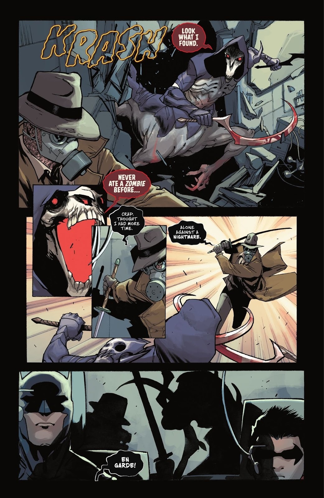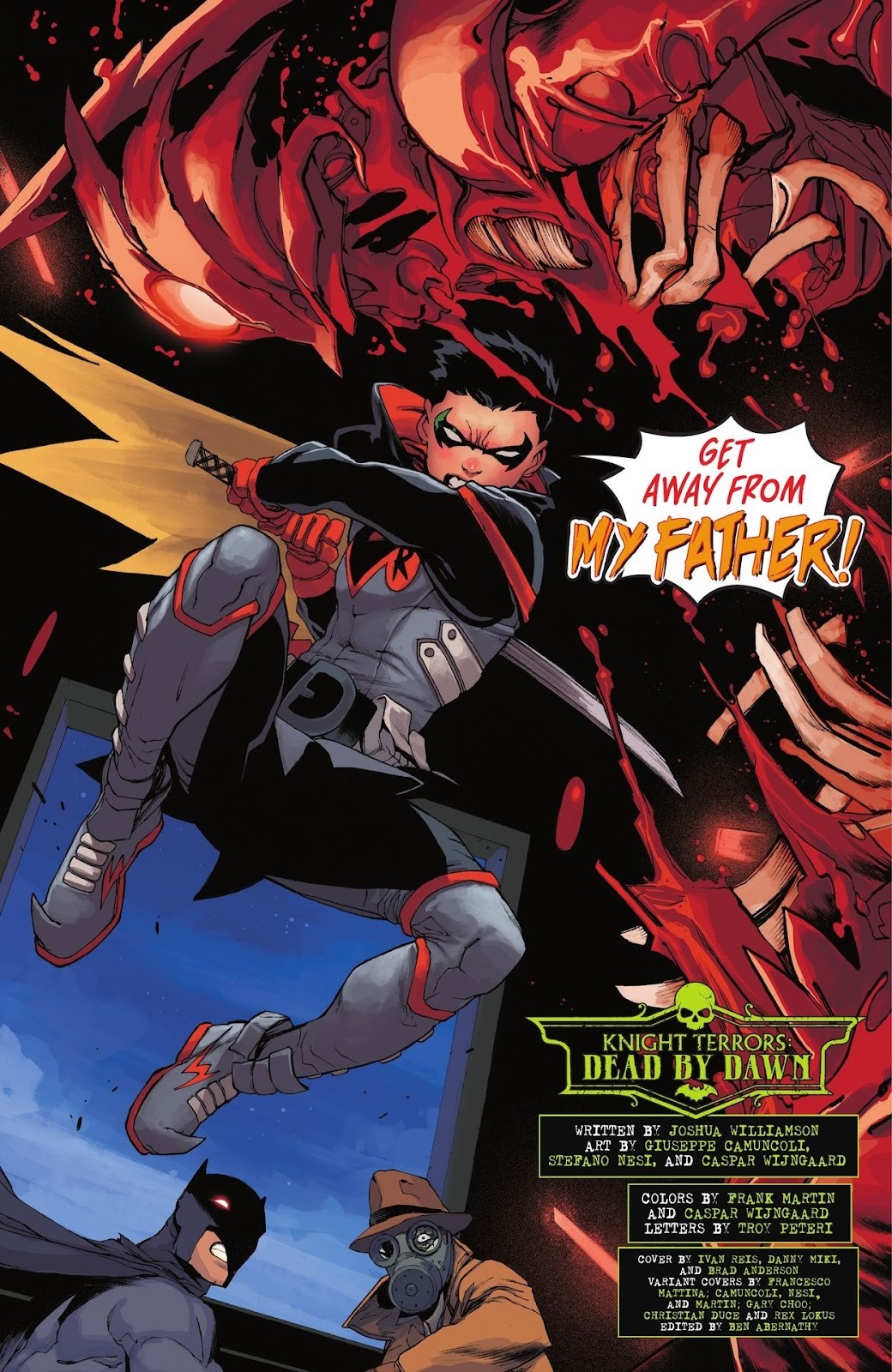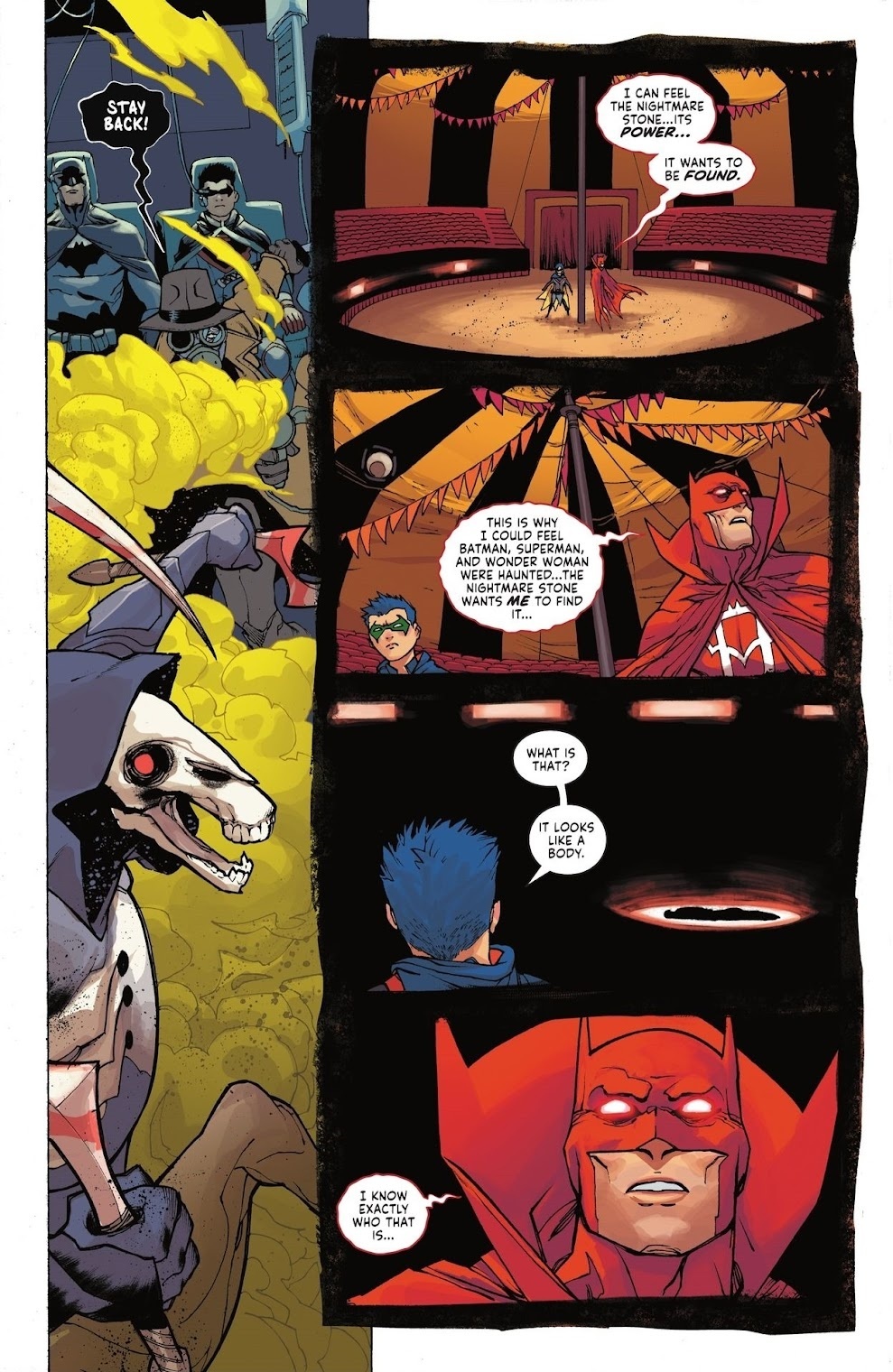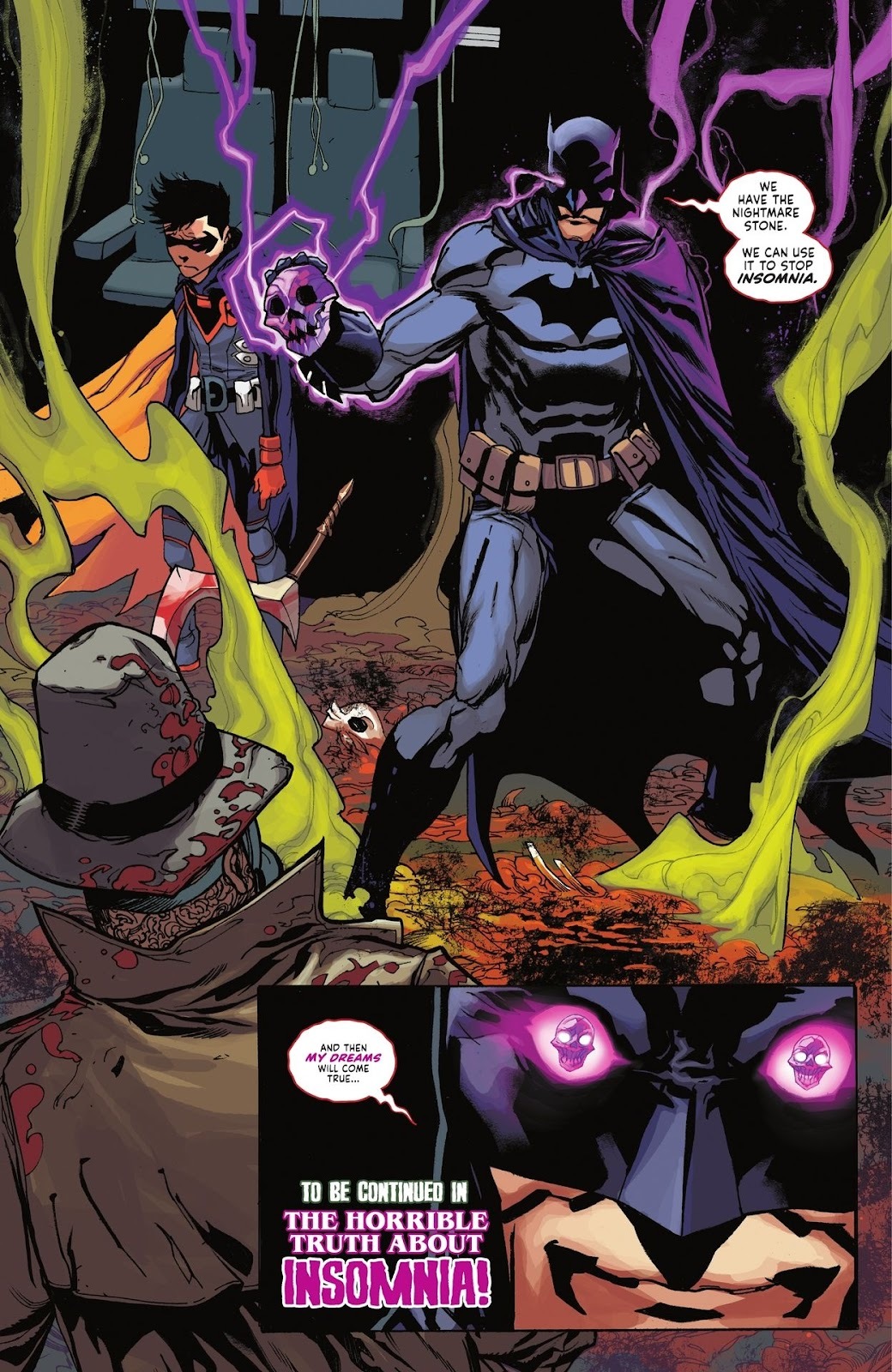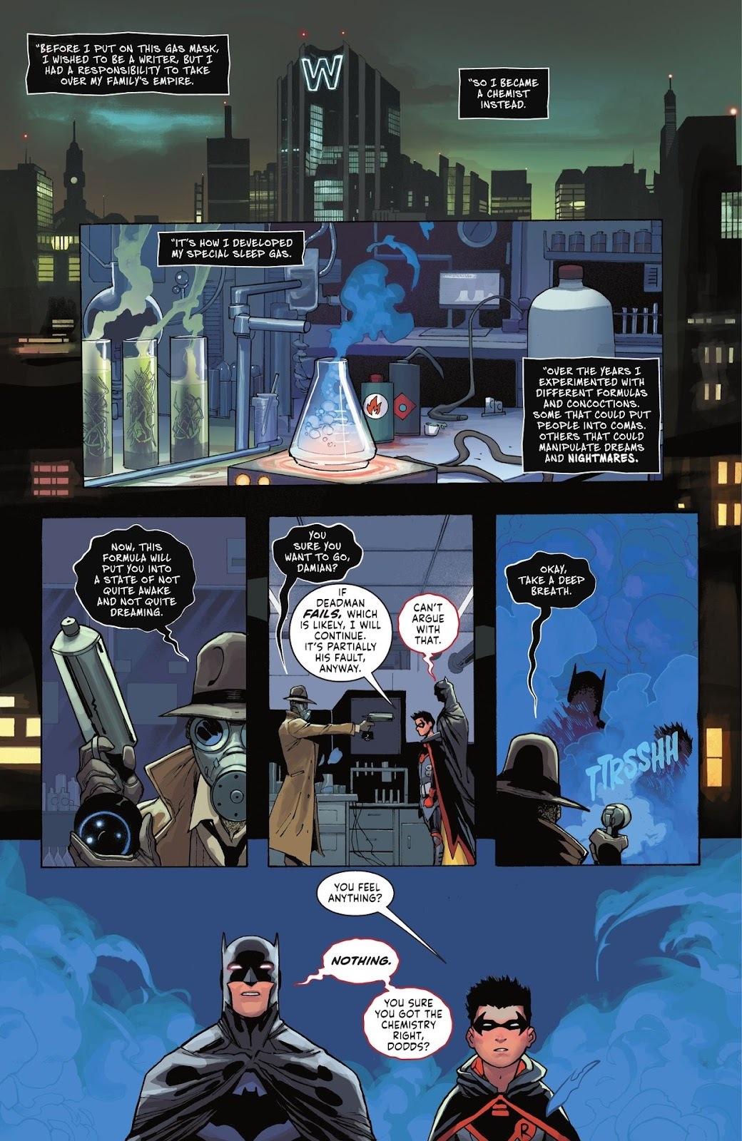只是即使如此,布魯斯本人的意識現在也不在這裡,沒有辦法以蝙蝠俠的身分活動。而在全世界都陷入睡眠的狀況下,達米安究竟是如何能夠保持清醒的呢?在故事發生前,達米安曾經做了有關失眠出現的惡夢,於是跑去找到了一批專精於訓練如何在任何情況下都保持清醒的大師們,向他們請教了各種技巧,現在才能勉強維持活動。
