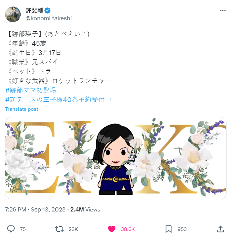 沒想到昨日 ( 9/14 ) 作者許斐剛在 X 上發布,關於跡部瑛子的個人設定資訊,其中讓人噴飯的設定讓不少粉絲感到驚訝,原來跡部媽媽真的是狠角色!