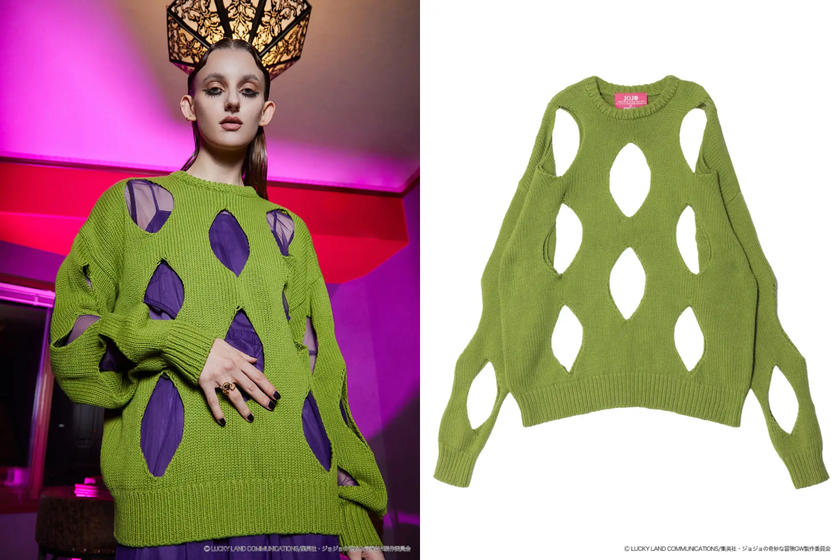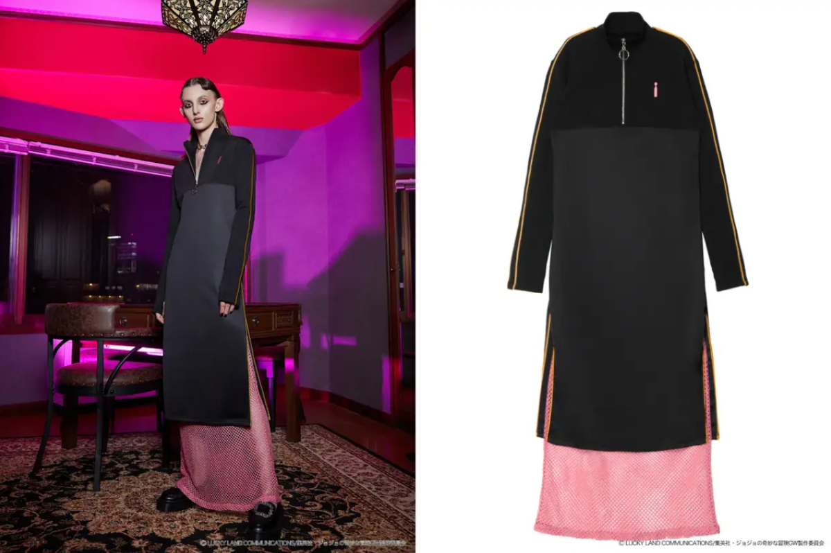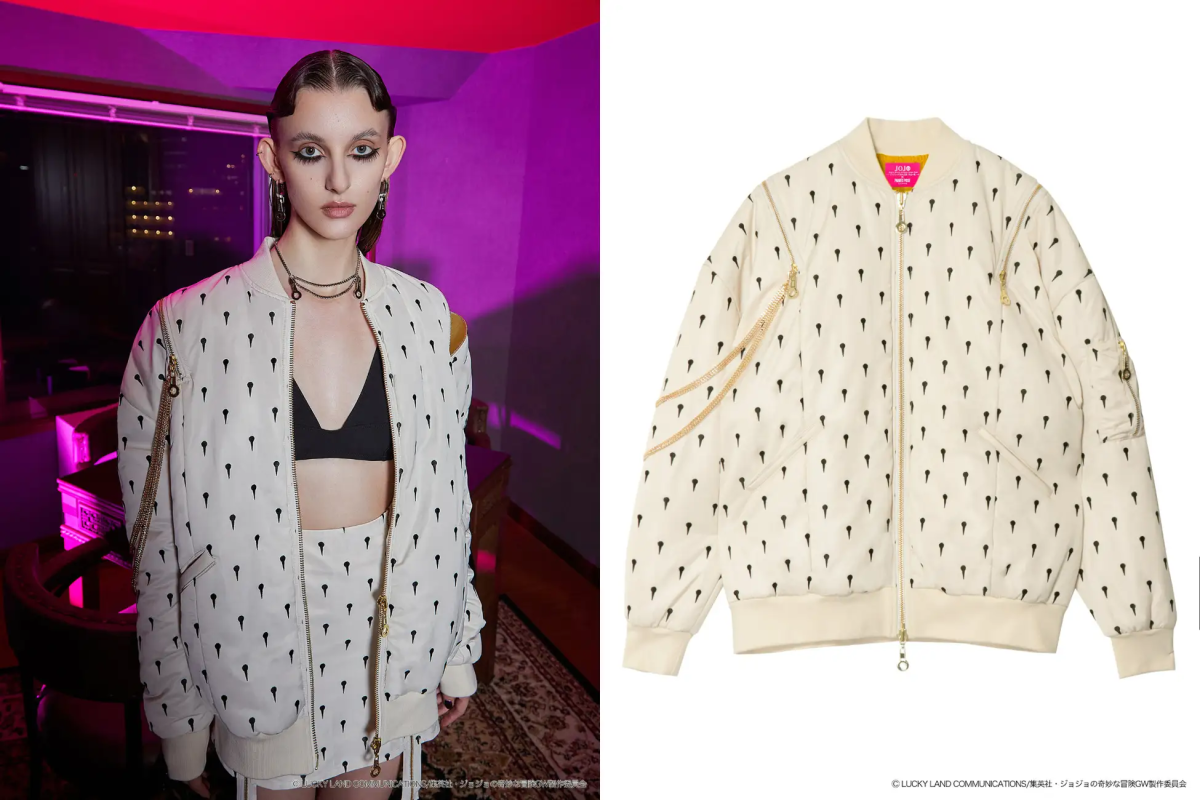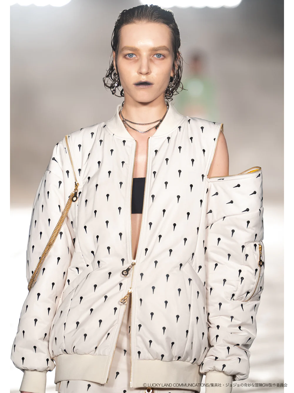 這次與《JoJo的奇妙冒險 黃金之風》合作,因為劇中人物設計都有著強烈的服裝特色,品牌選擇將這些設計元素變幻成各種服裝與配件上,並加上品牌喜愛的異材質與強烈風格,兩者的風格非常契合,組合出獨樹一幟的搭配選擇。