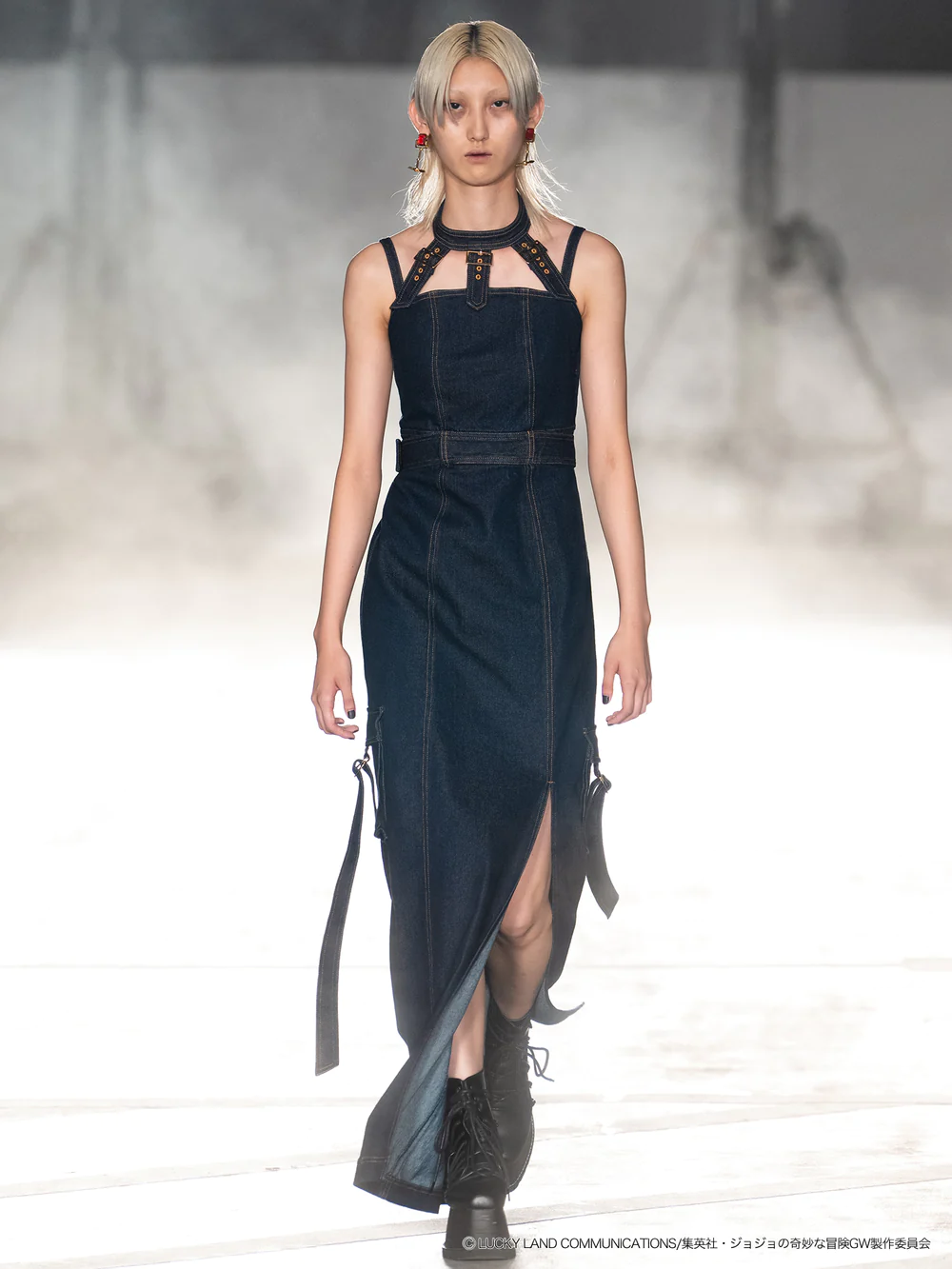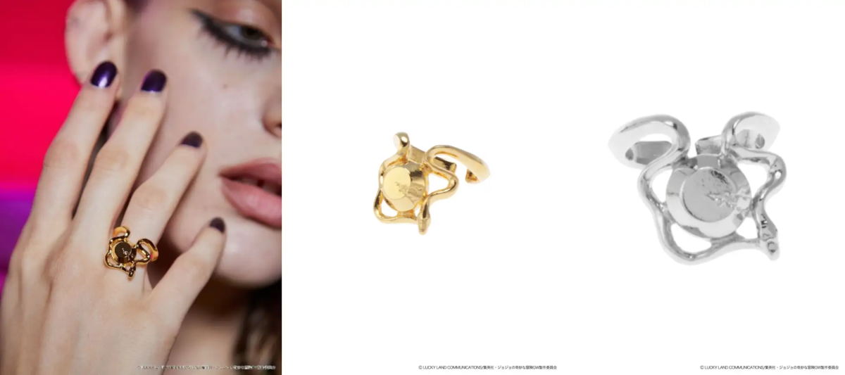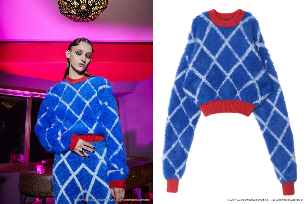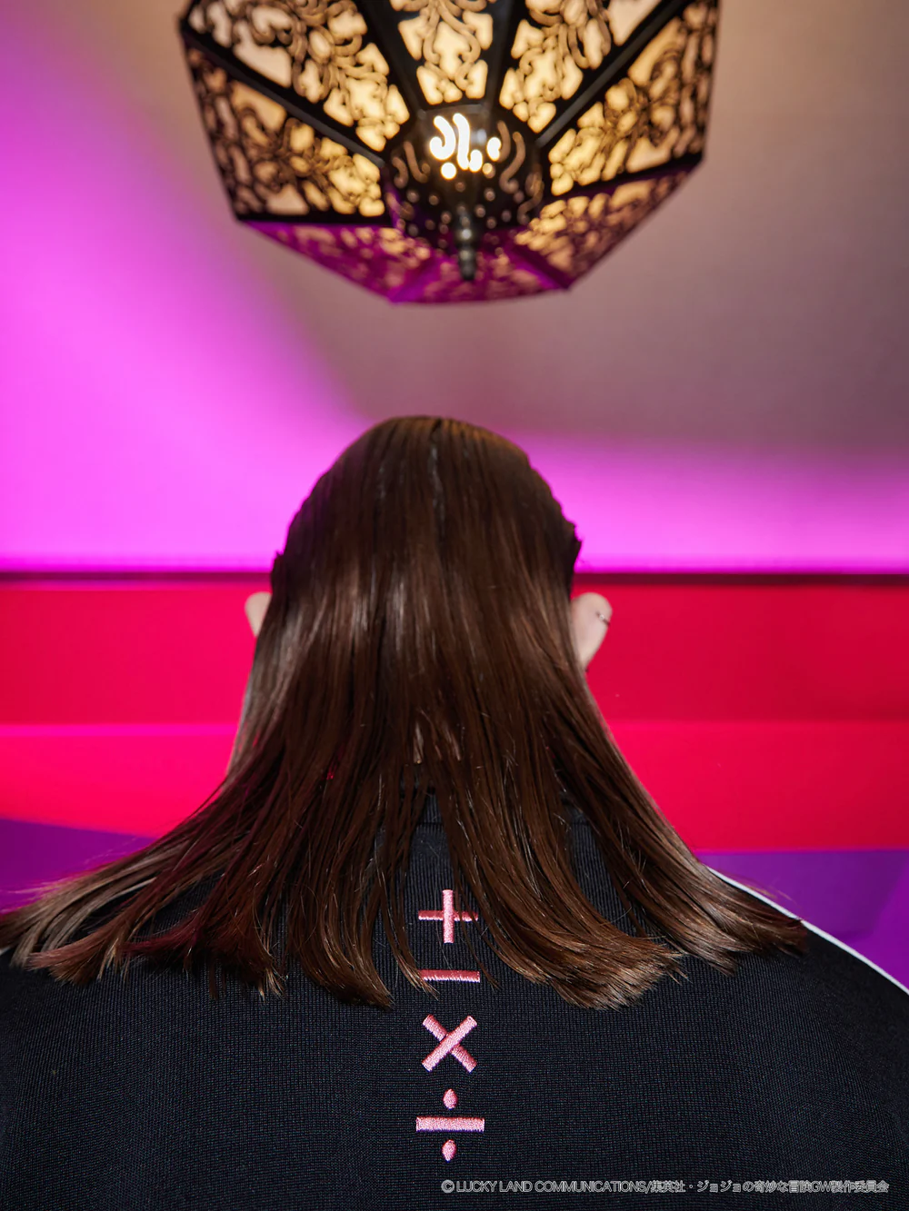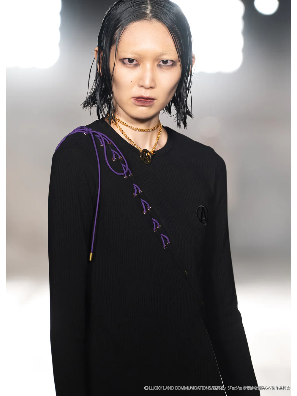 這次與《JoJo的奇妙冒險 黃金之風》合作,因為劇中人物設計都有著強烈的服裝特色,品牌選擇將這些設計元素變幻成各種服裝與配件上,並加上品牌喜愛的異材質與強烈風格,兩者的風格非常契合,組合出獨樹一幟的搭配選擇。
