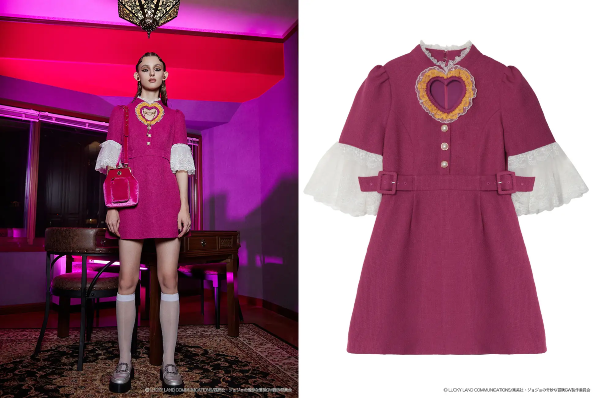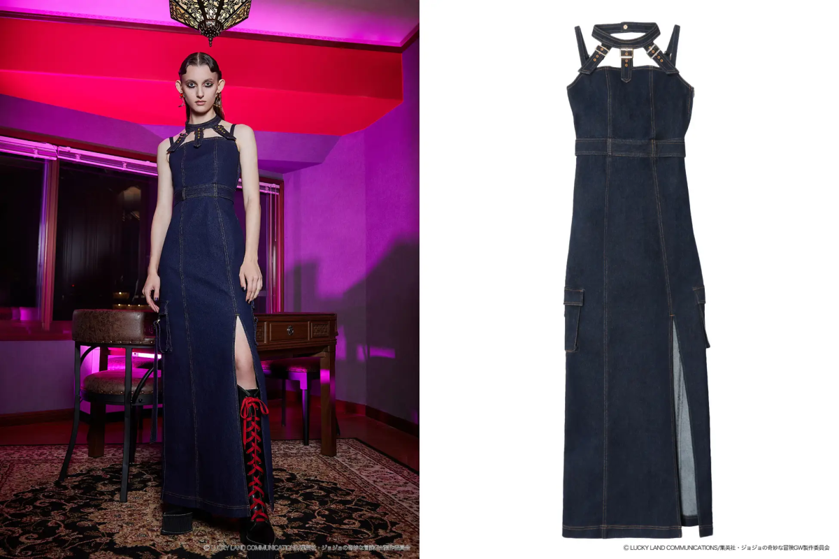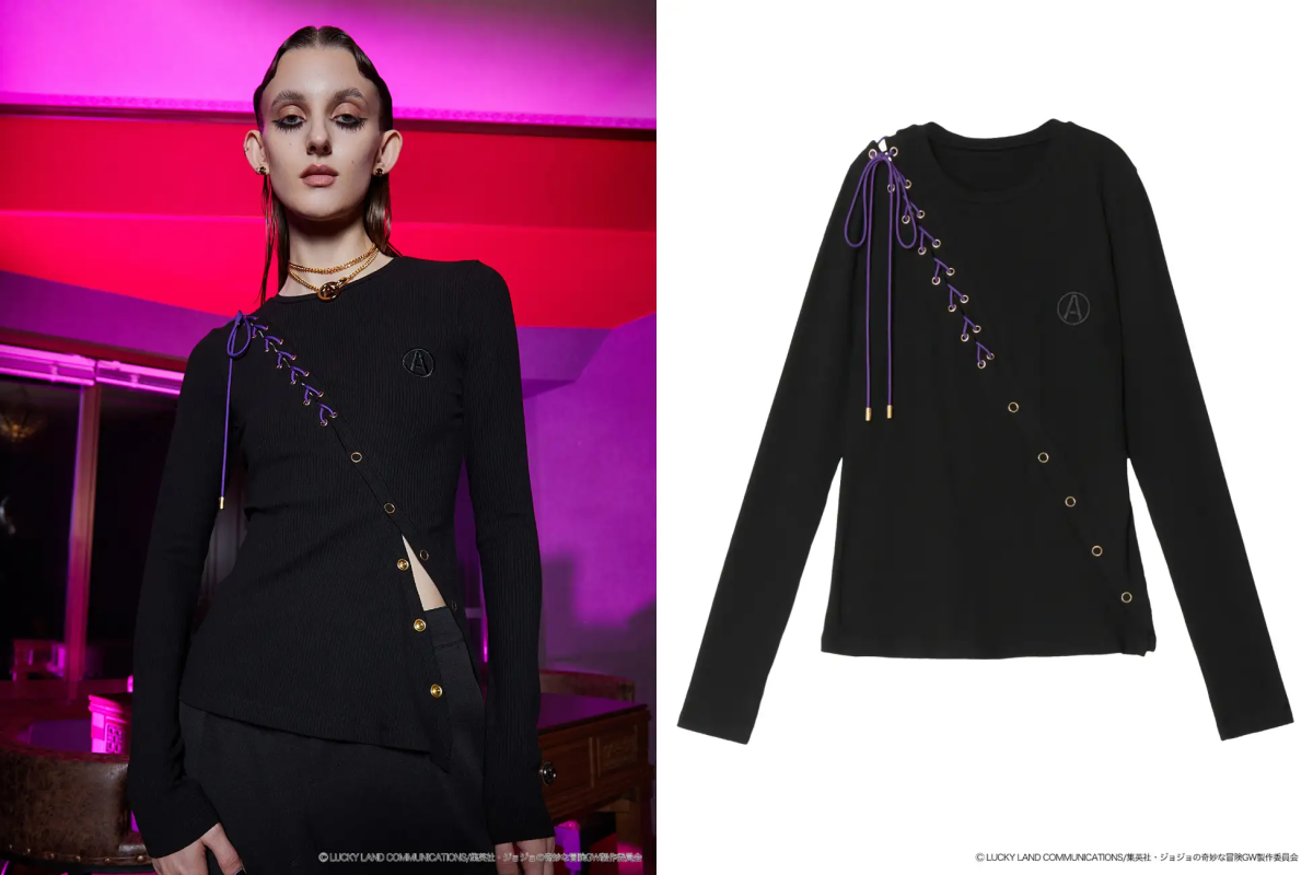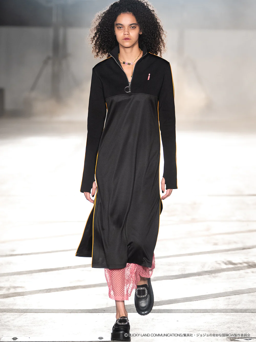 這次與《JoJo的奇妙冒險 黃金之風》合作,因為劇中人物設計都有著強烈的服裝特色,品牌選擇將這些設計元素變幻成各種服裝與配件上,並加上品牌喜愛的異材質與強烈風格,兩者的風格非常契合,組合出獨樹一幟的搭配選擇。