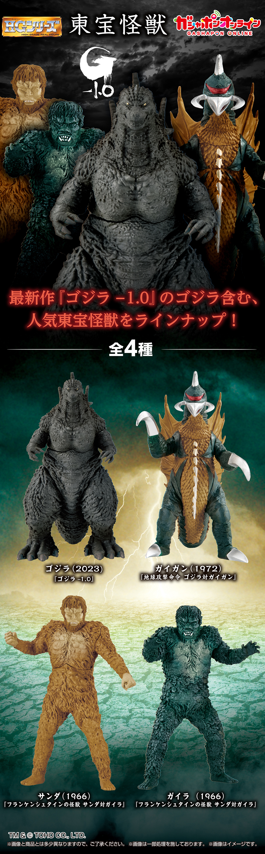 「HG 東堡怪獸」轉蛋,在 10 公分的小尺寸中凝聚精密造型與塗裝細節,生動呈現東寶怪獸特色的外觀。收錄有哥吉拉系列最新電影《哥吉拉-1.0》的「哥吉拉-1.0」,為系列首次立體化!另外還有經典的怪獸們—《地球攻擊命令 哥吉拉對蓋剛》的「蓋剛(1972)」,《科學怪人的怪獸 山達對蓋拉》的山達(1966)、蓋拉(1966)一共五款怪獸!