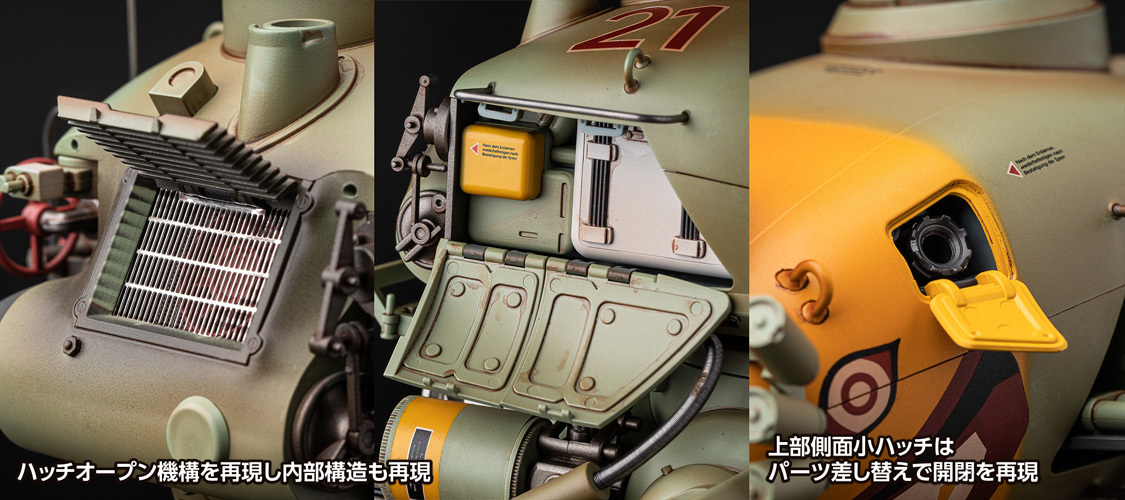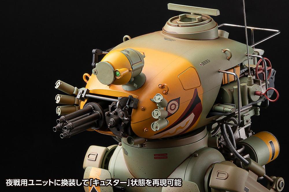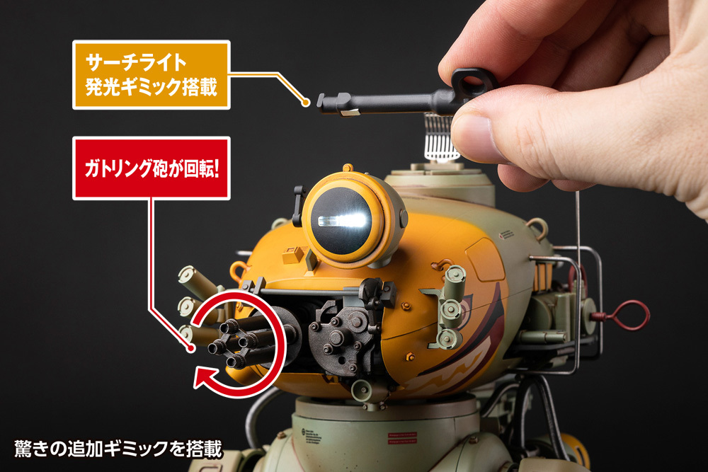 在 Ma.K 的設定中,KRÖTE 是修特拉爾軍用以偵查的雙足戰鬥無人機械,本作高約 21 公分(不含天線),雙足採用金屬材料製作,除了精美的鯊魚頭樣式塗裝與舊化、細膩的機械結構刻畫之外,核誠治造還注入了 LED 發光功能、可轉動的格林機槍、艙口可開啟享受內部機構這些超讚的把玩要素,更能夠搭配 75mm 的長短炮管、夜戰用設備、天線......等豐富替換件把玩出 KRÖTE、Pak.KRÖTE、改良型 KÜSTER 這三種型態,各位玩具人也可以用額外的水貼進行客製化,真的酷到不行!