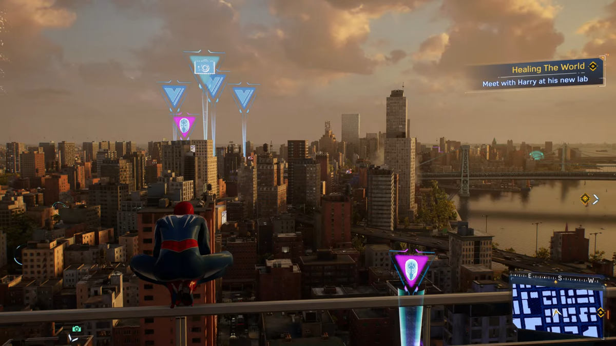 更方便的是,由於在蜘蛛面具的鏡片中,新增了嶄新的「AR技術」,因此玩家在進行主線、支線任務時,便能透過從AR鏡片投射出來的圖示,來查看已發現的活動並進行解鎖。