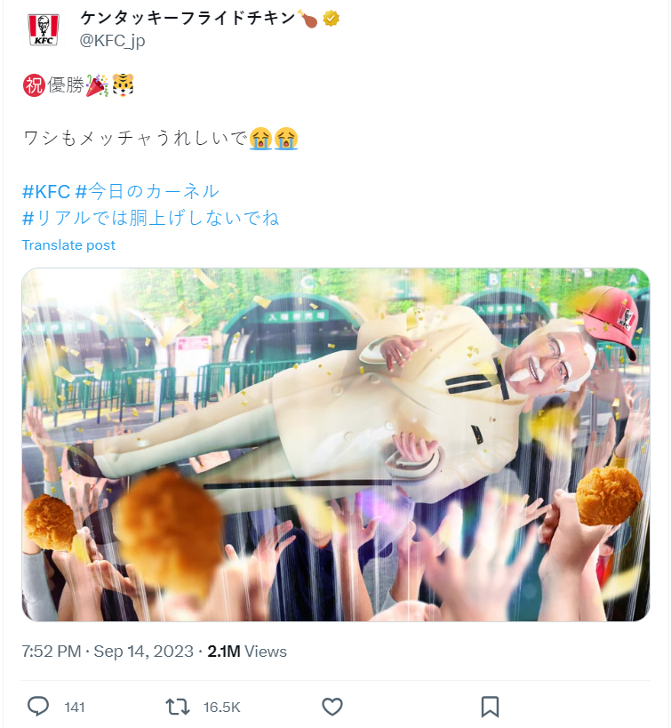 這次被大家關注的「肯德基爺爺」,官方 X 也發文慶祝,不過這次球團與警方都宣導不要再把他丟下河,球迷也安分的沒亂搞,只把自己丟下去而已 www。