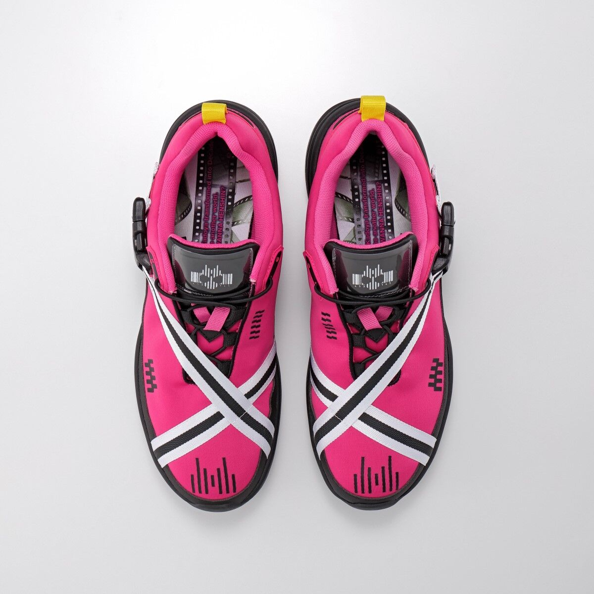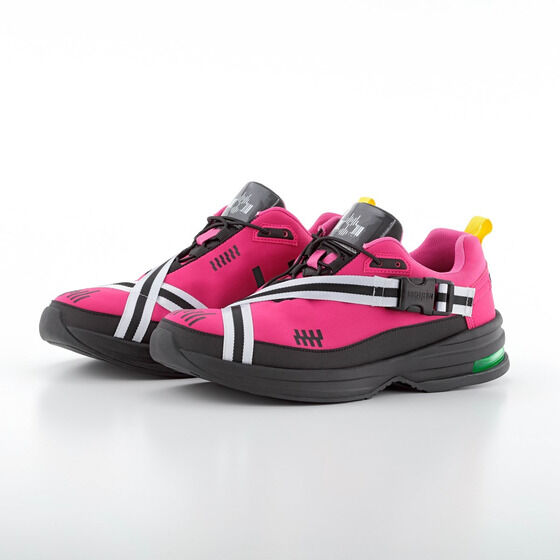 這次推出的造型球鞋,以《假面騎士Decade》身上的配色與線條為靈感打造,以桃紅色&黑白織帶作為搭配,鞋面透過織帶的交叉視覺效果更加搶眼,鞋子中底後跟處配置有亮綠色的裝飾飾片,象徵 Decade 的眼睛。