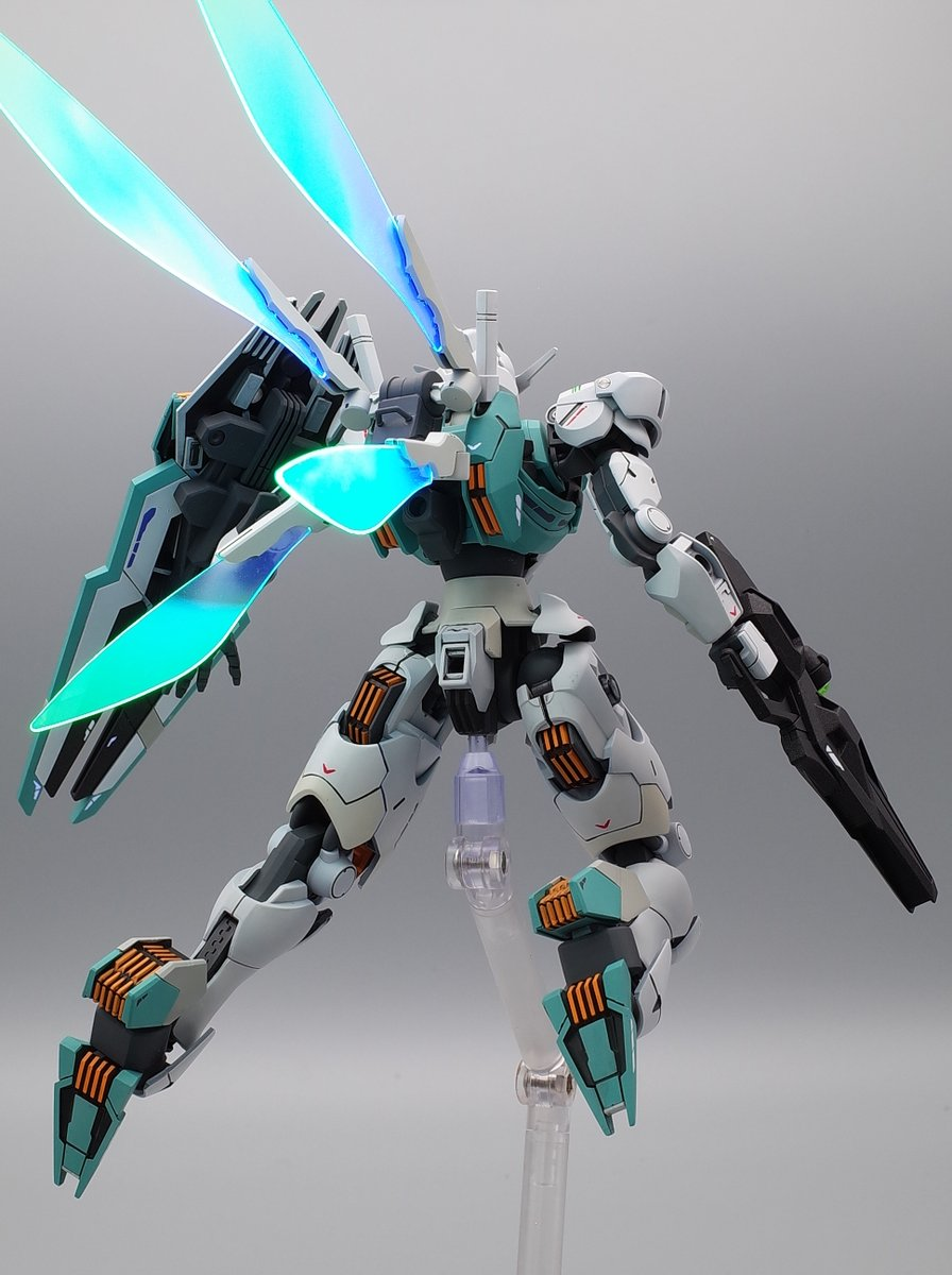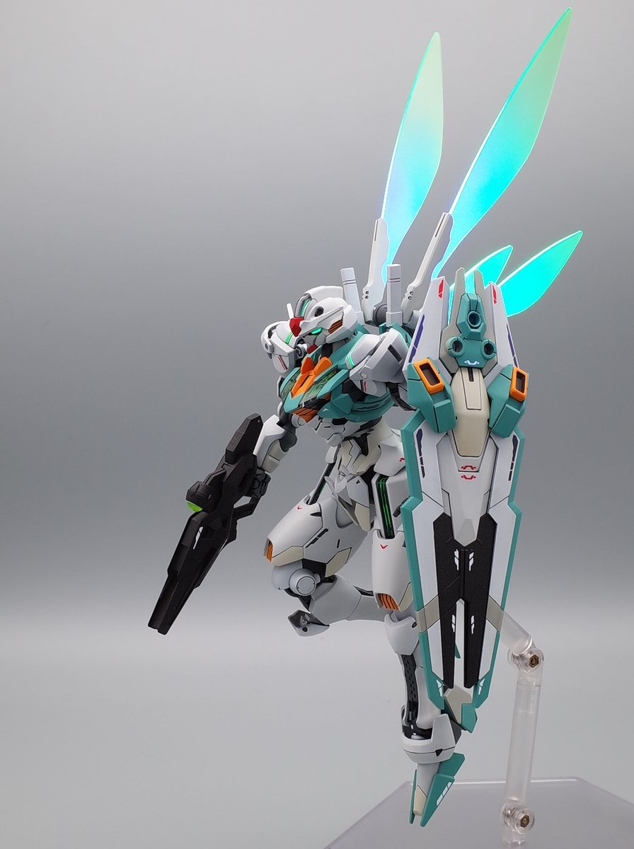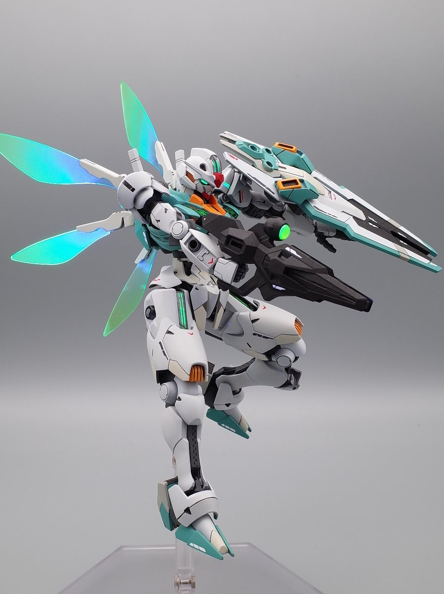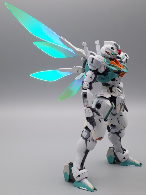 翅膀經過塗色,整個有螢光的色彩,更具有動畫中機體實戰的韻味,搭配機體重新塗色的改變,更有所謂風靈鋼彈「風之妖精模式」的獨創性。