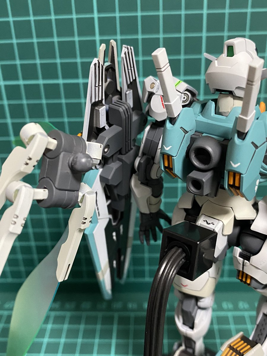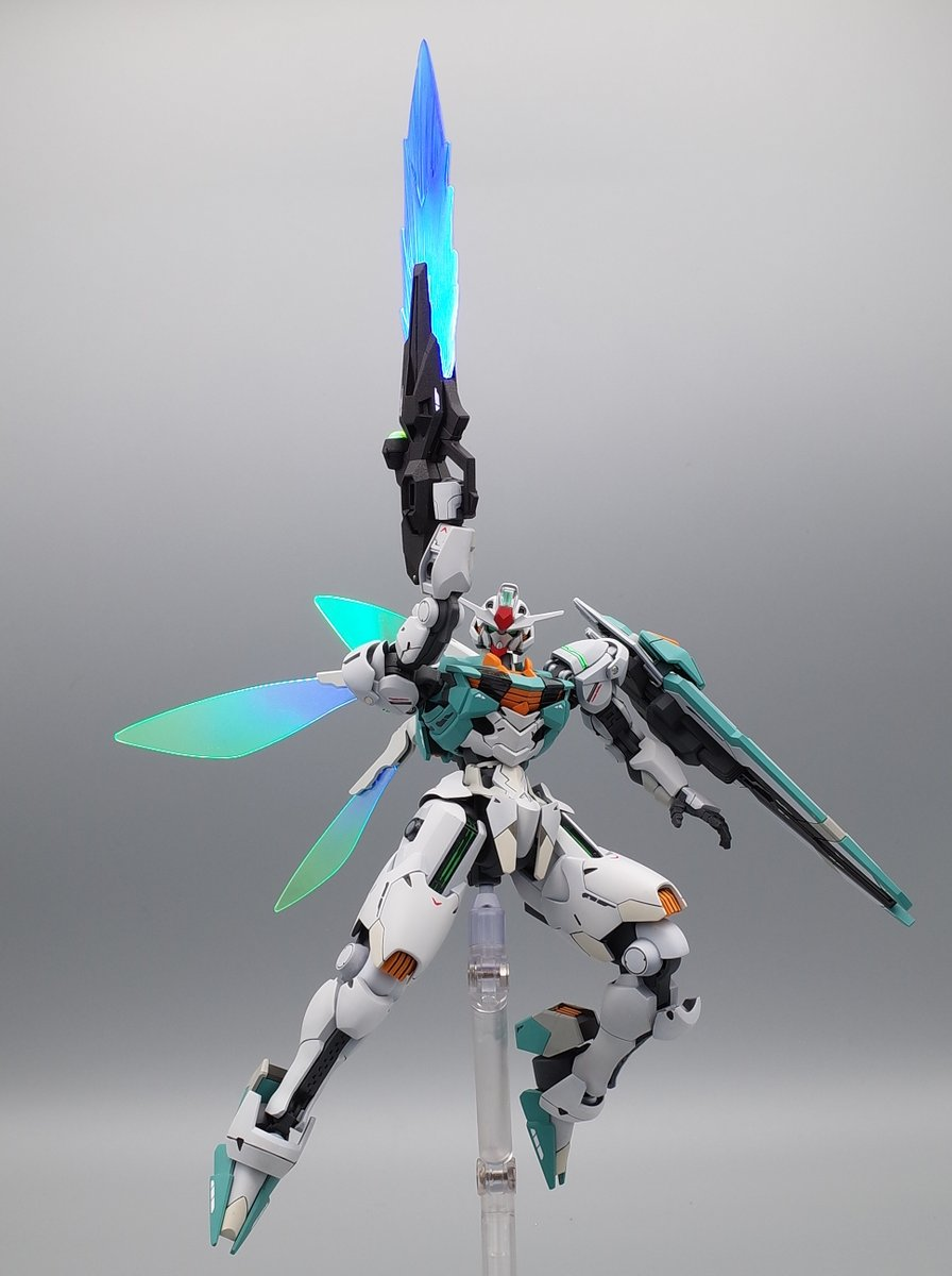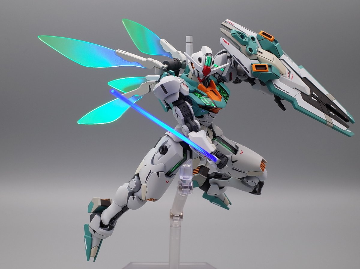 翅膀經過塗色,整個有螢光的色彩,更具有動畫中機體實戰的韻味,搭配機體重新塗色的改變,更有所謂風靈鋼彈「風之妖精模式」的獨創性。