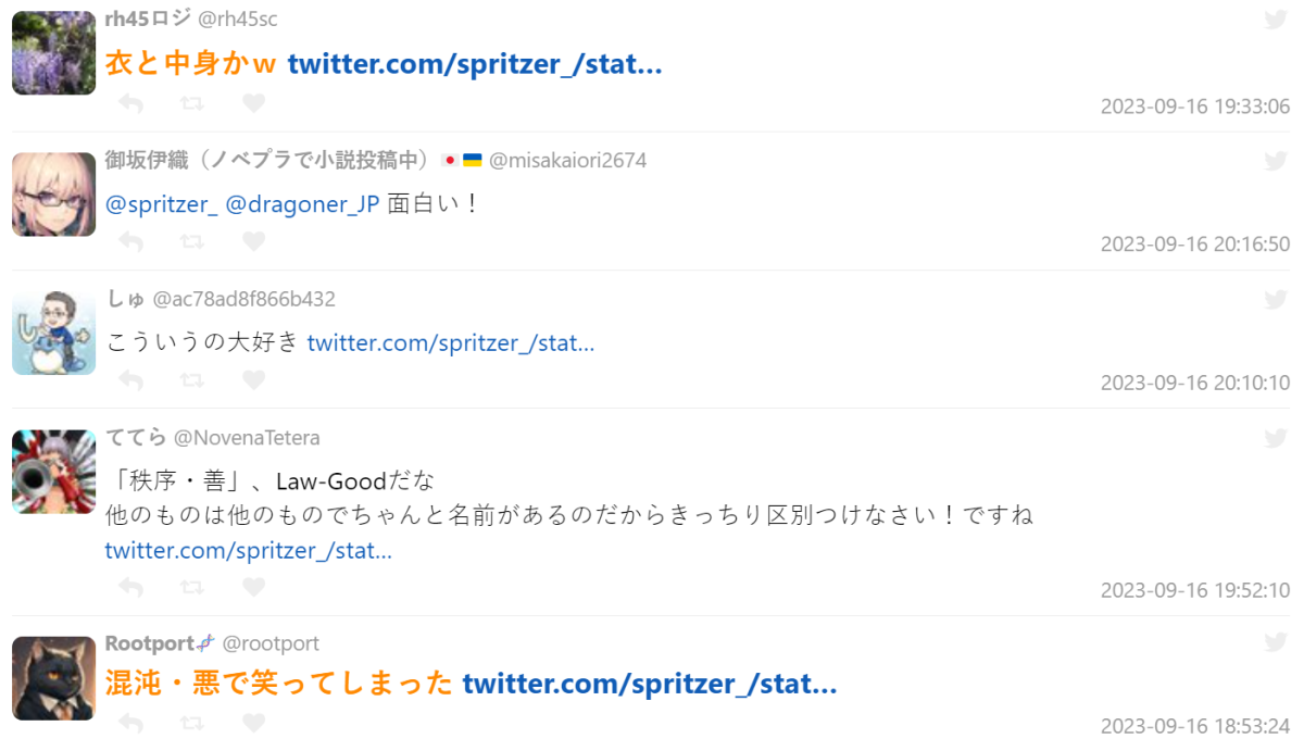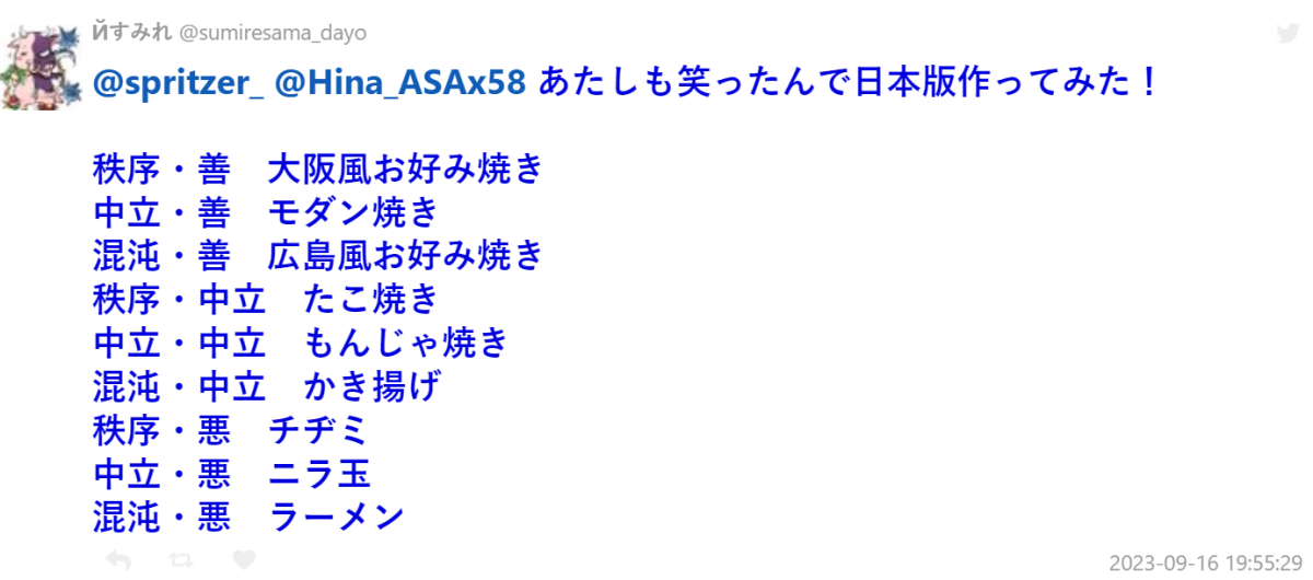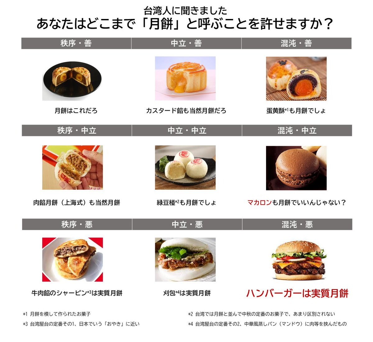 可以看到這是一個「月餅九宮格」,由肉卡 ( @rocavence ) 網友所發出,對他來說這些東西都可以稱作是月餅,也分成所謂的守序、中立、混沌以及善良、中立、邪惡的區分法,分別放入九種...月餅。而這也被日本網友拿去翻譯,因為連他自己看到這個也笑了,原來這種梗圖日本人也是能 Get 到的 www。