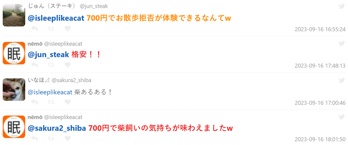 就是這隻黑色的柴柴,推主表示花了 700 日圓享受半小時的蹓柴體驗,結果整個半小時這個黑柴都處於「拒否柴」一動也不動的狀態,結果花了錢體驗被柴柴拒絕的感覺,雖說聽起來有點可憐。不過推主表示很值得,真實體驗拒否柴的威力 XD。