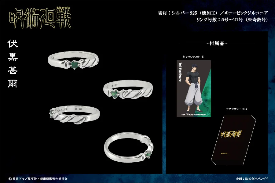 日本萬代旗下專門推出角色主題服飾、生活週邊的「BANDAI FASHION COLLECTION(バンコレ!)」, 近日宣布以話題動畫《咒術迴戰 懷玉·玉折篇》為主題推出三位人物的主題銀飾,共有 : 五條悟、夏油傑與伏黑甚爾,以人物的特色特別製作成戒指。售價為 13,200 日圓,目前已可於日本萬代 PB 網站預購。