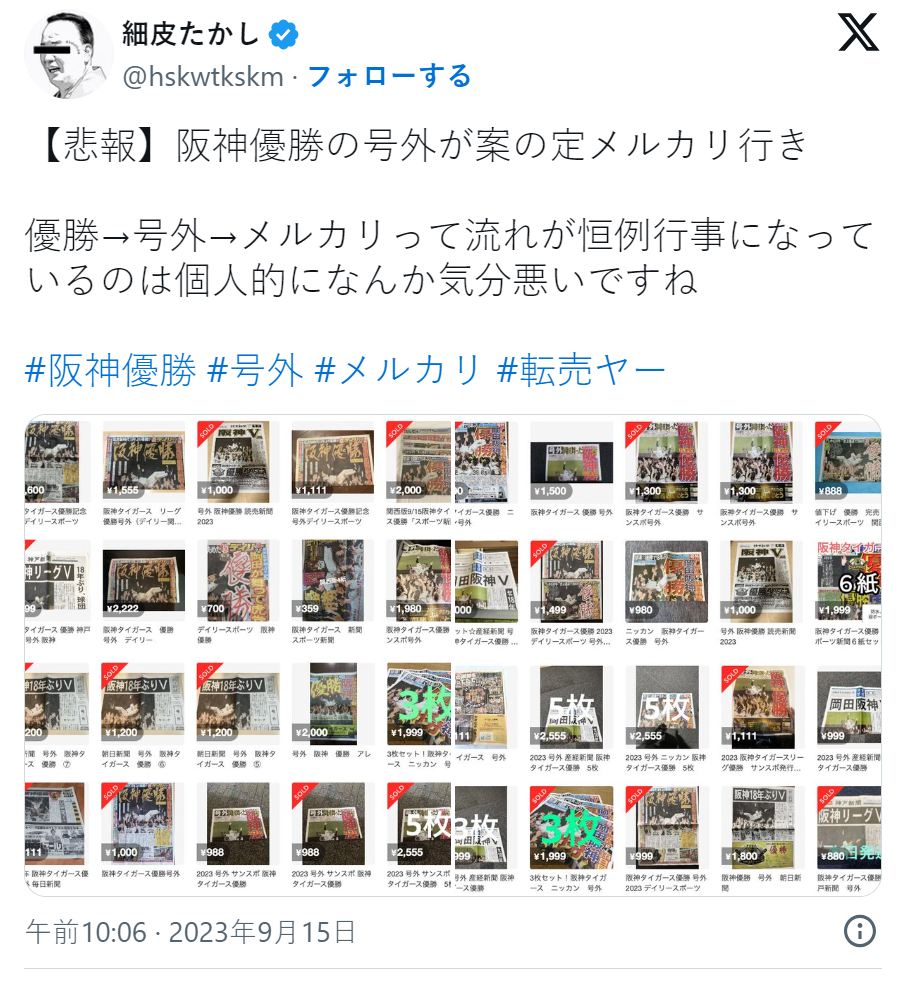 雖說這樣的現象或許也是可以預見的,但對於阪神虎球迷來說,這些轉賣的商人並非支持虎隊,只是想趁機賺一波錢財,反而讓真正的虎迷沒辦法以正常價錢買到這些東西,更是讓人感到不悅。