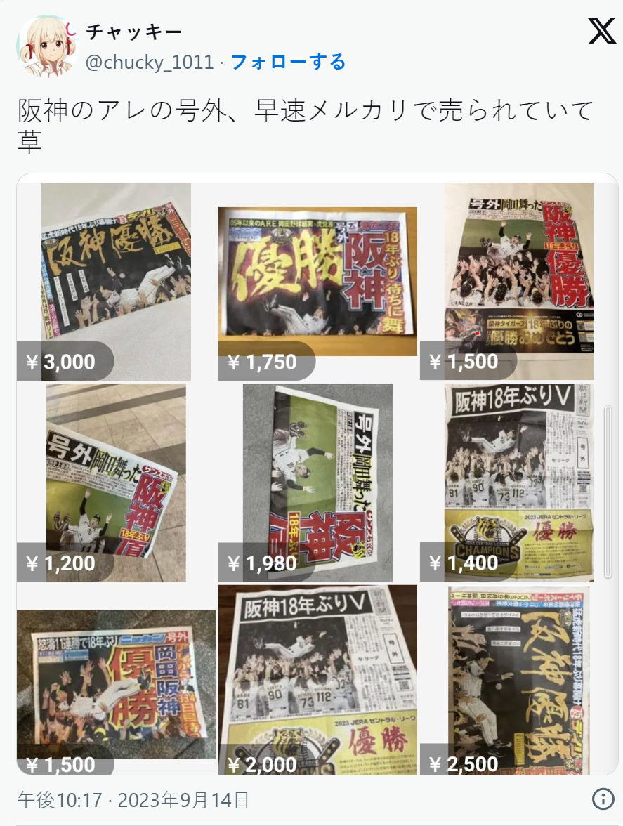 先前就有日本大學教授表示,阪神虎睽違 18 年來的優勝所帶來的商機,可望上看數億日圓起跳,不過現在看來,轉賣的商人非常快就嗅到這樣的商機,也造成日本網民與球迷大量撻伐,但這目前看來,也是難以制止的吧...。