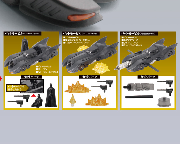 這次的三款分別為「蝙蝠車+蝙蝠俠套組」、「蝙蝠車+特效套組」、「蝙蝠車+裝備展開套組」,利用爆破與噴射特效、飛翼與引擎零件......等讓蝙蝠車把玩起來更具張力吧!
