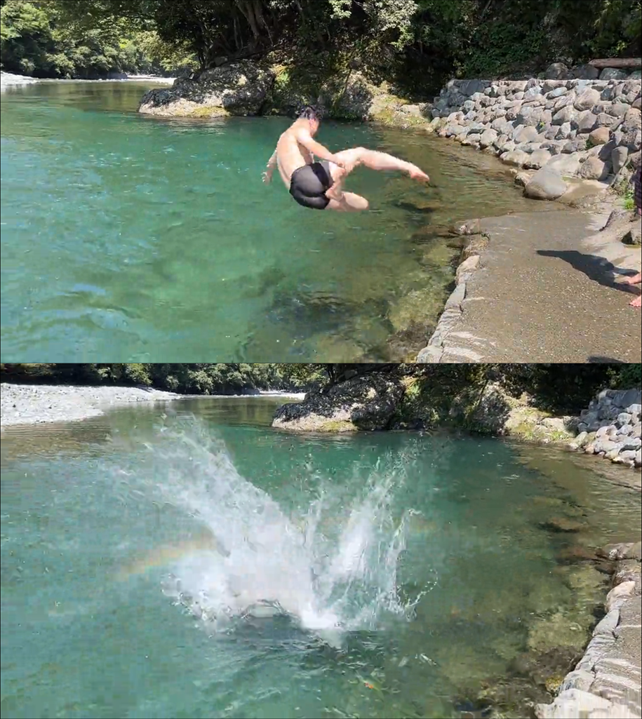 不過最近日本 X 上有位推主意外爆紅,他和朋友山梨縣的河川邊遊玩,嘗試跳水的時候意外錄下了落水瞬間「乍現彩虹」的奇妙景象,在 X 上瞬間爆紅成為網友關注焦點。