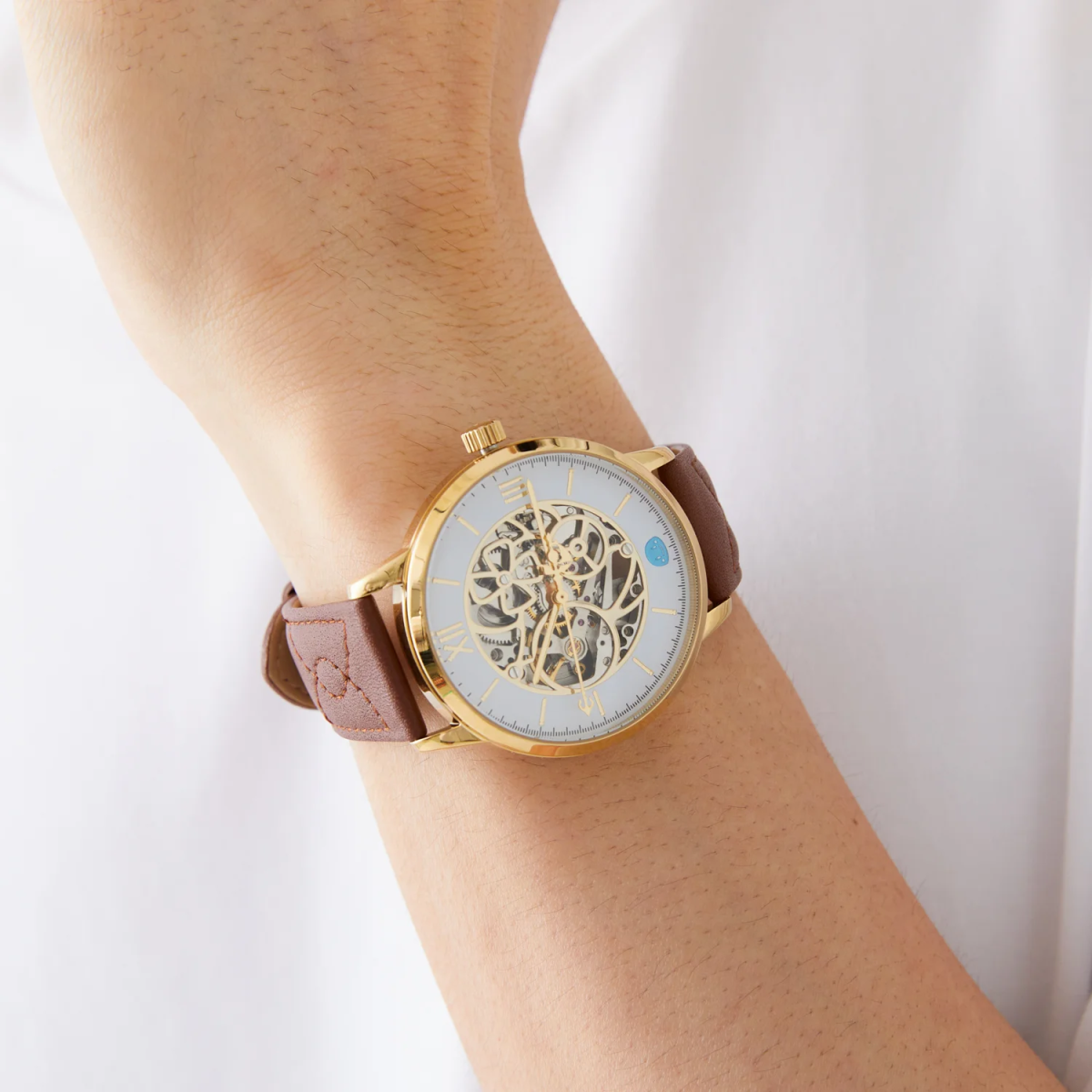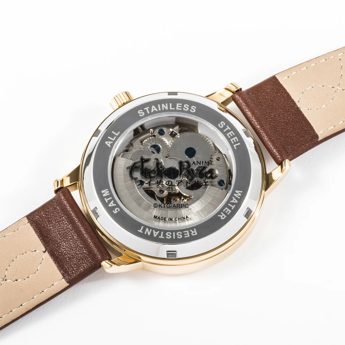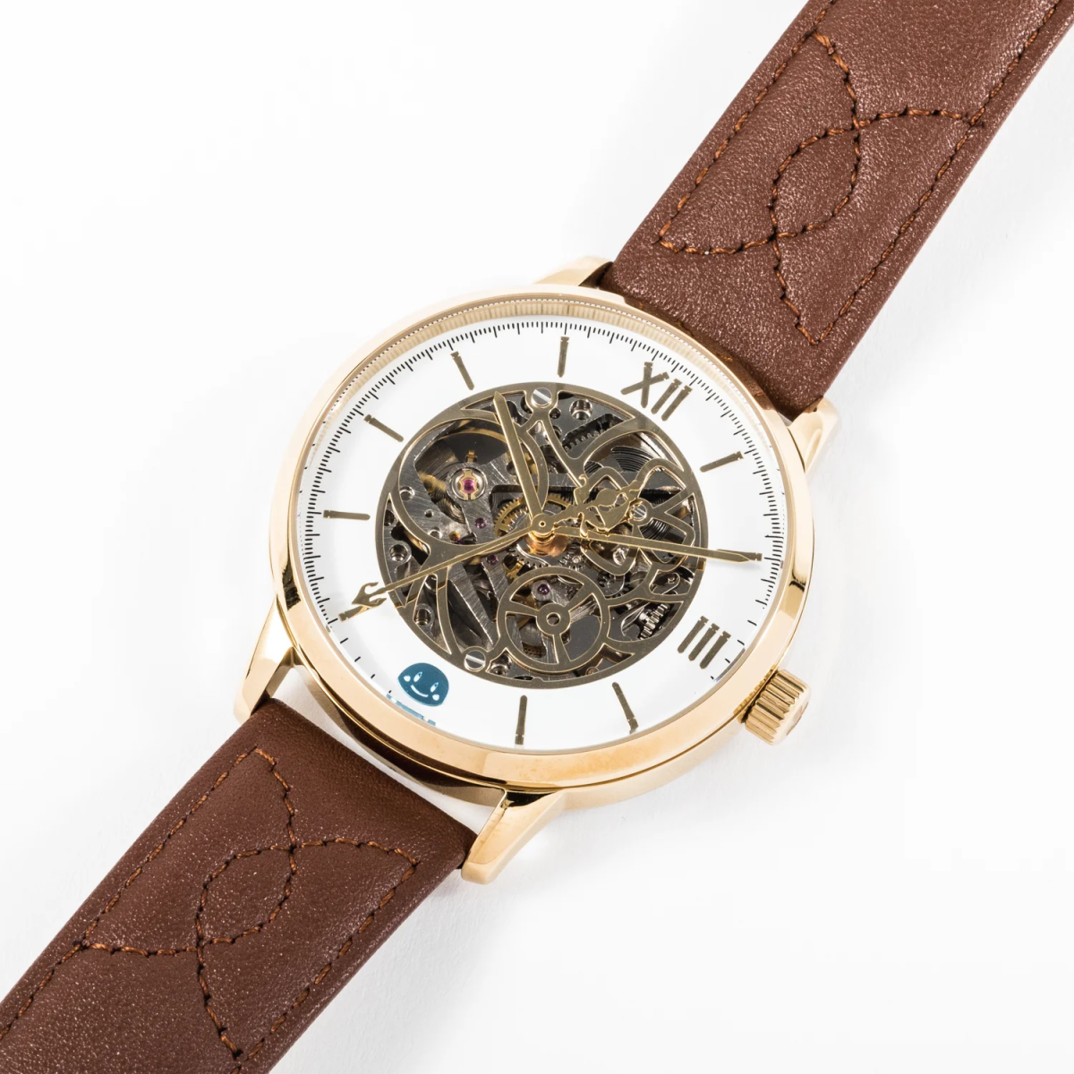 採用萊莎的服裝為靈感設計,錶面採用鏤空齒輪外顯為最大特色,搭配金色的指針與數字字樣,錶帶採麂皮的咖啡色樣式,整體呈現出復古氣息。