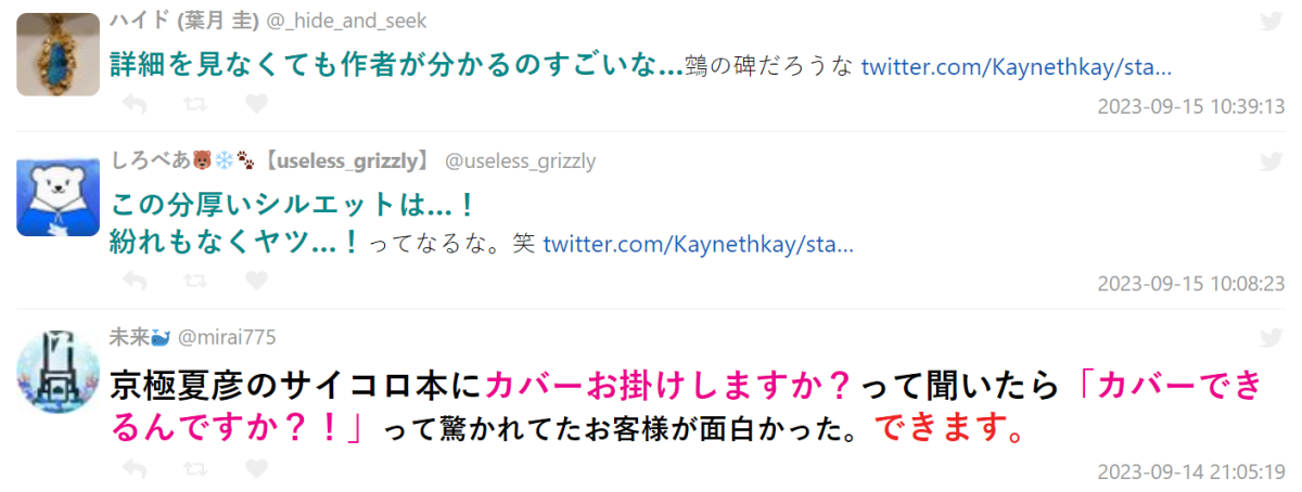 因為京極夏彥的長篇小說都以「超厚」為特色,不少人光是要找到適合的書套收藏都很難,而這位紀伊國屋的店員的堅持,讓他意外發現他們的書套居然可以完整包裹這本書,看起來也非常適合。