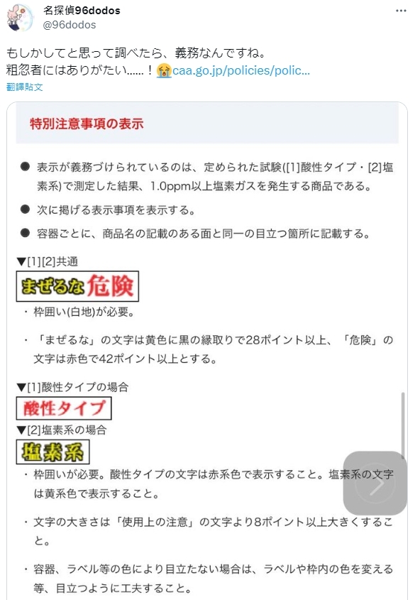 比如說警語一定要和商品名稱在同一面、警語必須是用框線圍起來的白底區塊、「まぜるな」字樣必須是黃字黑邊而且大於28號字、「危険」 必須是紅色而且大於42號字,另外酸性清潔劑要用紅字標示、氯系清潔劑要用黃字黑邊標示,而且都需要比「使用注意」的內文再大8號字以上......等等。