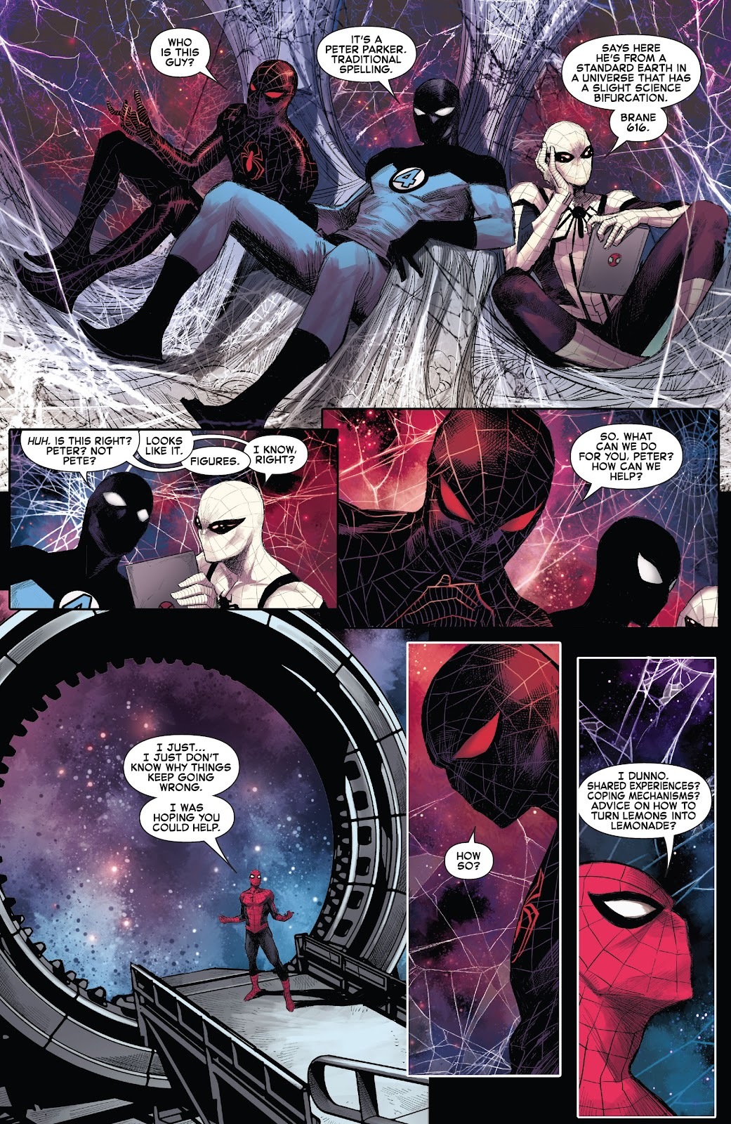 在這個故事中,正史宇宙的彼得透過一道神奇先生(Mr. Fantastic)製作的「架橋(The Bridge)」而來到了一個像是蜘蛛議會的所在。他向這邊的三位領導人尋求建議,希望他們可以告訴他怎麼解決有關自身的危機,以及他為何要一直受苦的理由。