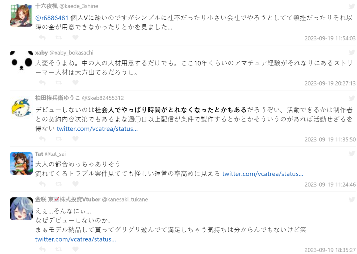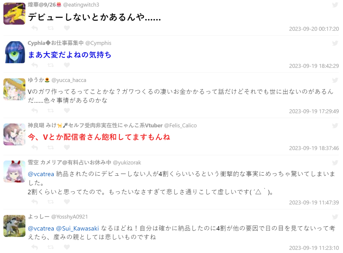 根據自己也是 VTuber 的 Live2D 製作兼繪師 カトレア ( @vcatrea ) 表示,自己曾接到不少委託請求,但就其在業界的消息得知,大概有四成的 VTuber 已經製作好皮後,卻選擇不出道,等於這筆錢幾乎就是放水流了。對於現在活動中的 VTuber 應感到尊敬,畢竟第一個門檻他們已經跨過了,現在仍在觀眾面前活動已經很厲害了。