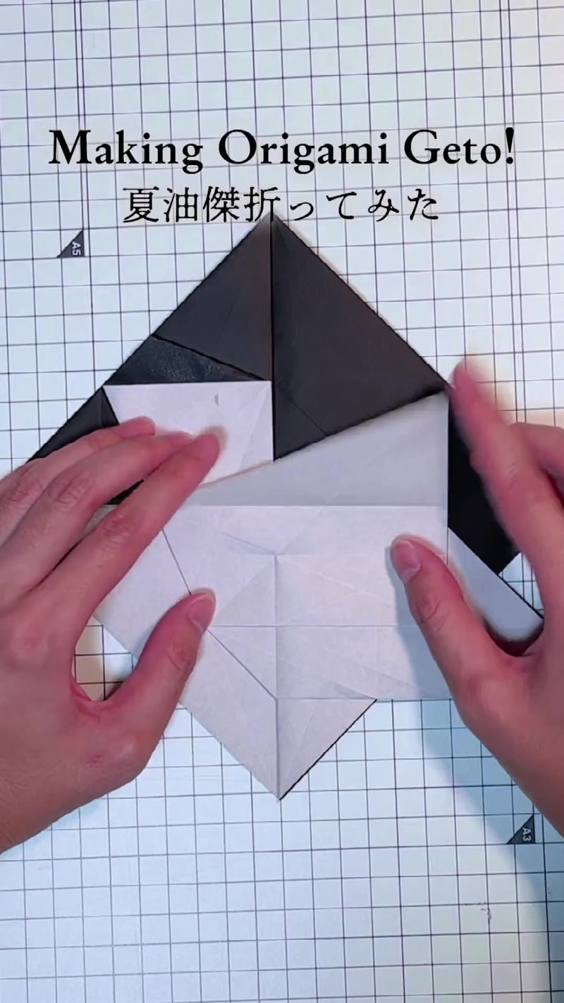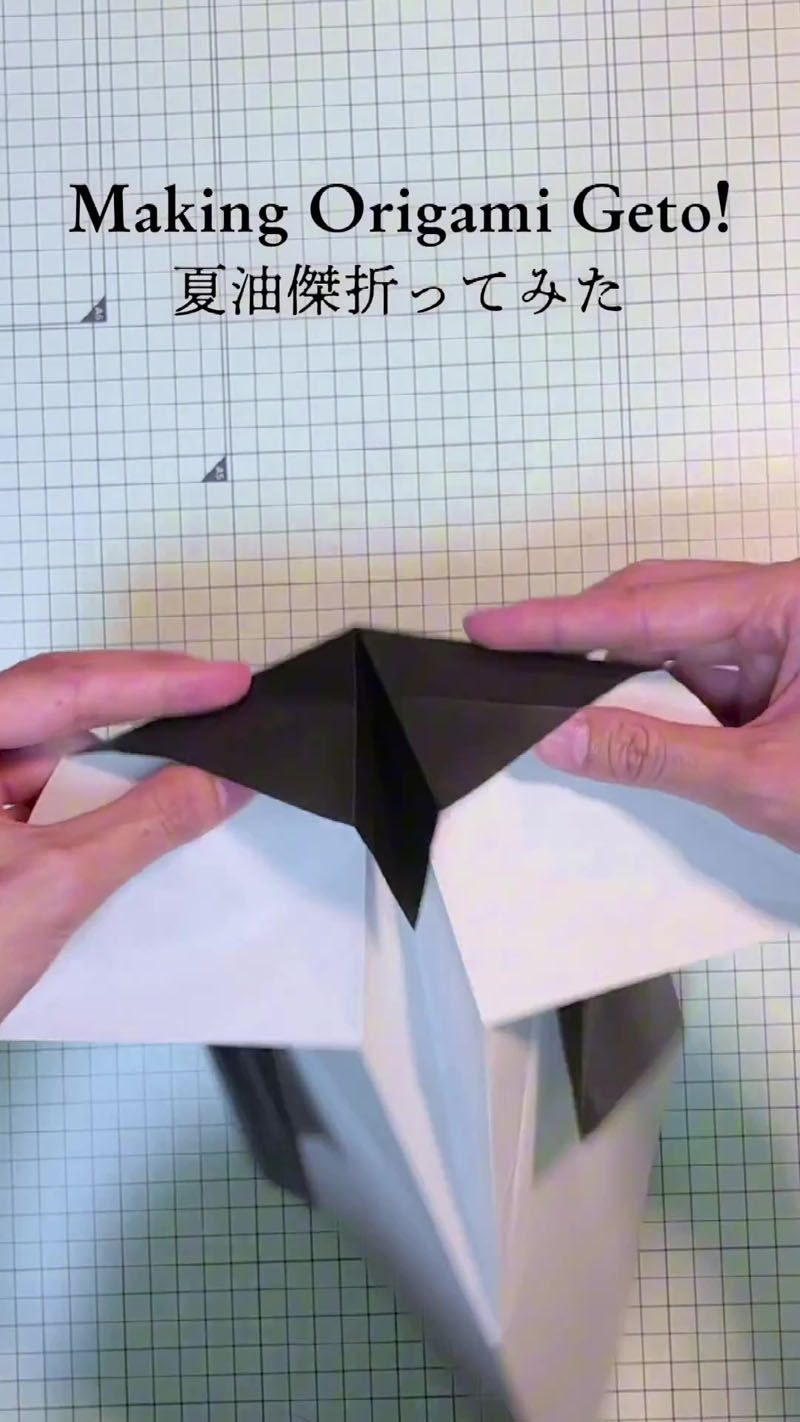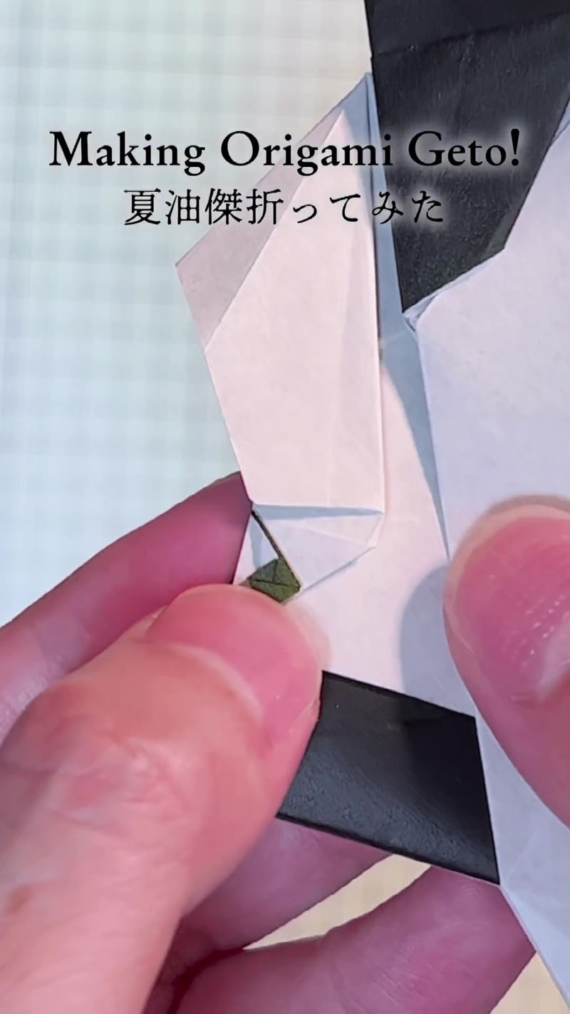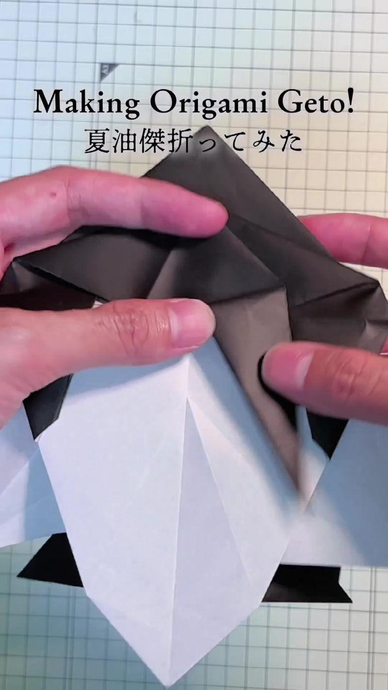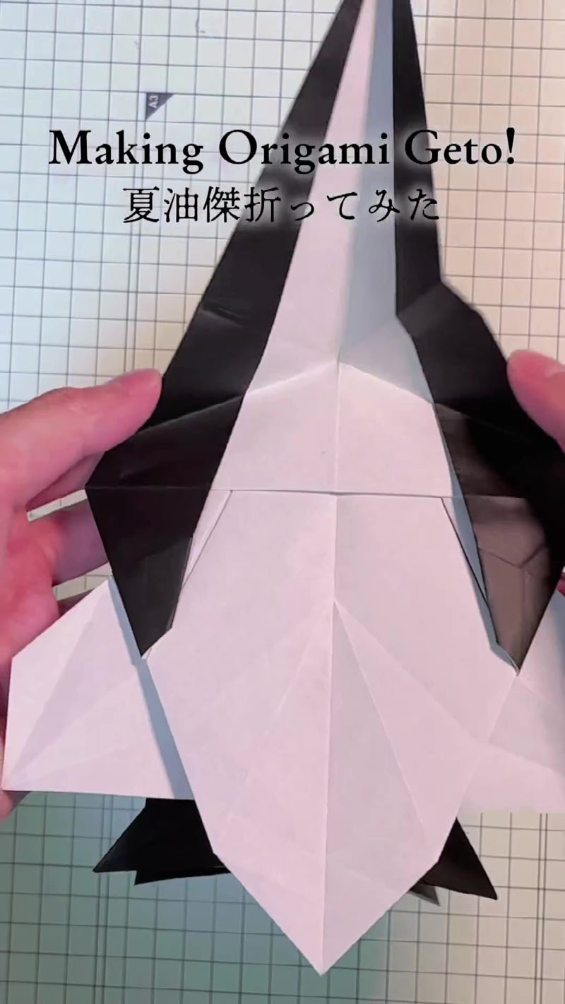 日本一名折紙作家山本大雅利用一張大張的黑色色紙摺出了作中的反派之一夏油傑,僅用一張色紙就能摺出!?到底是怎麼摺的,這儘管是看影片上摺紙的痕跡也看不出是怎樣摺的,只知道這也太厲害了,不管是夏油垂下的前髮和耳朵上標誌的耳飾都表現出來了。