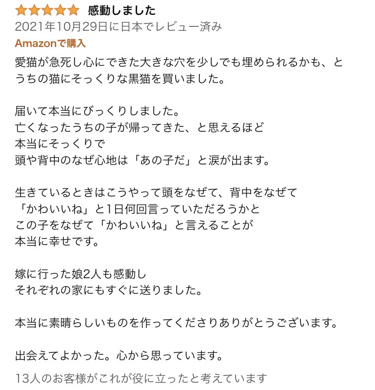 消者者表示,看到這製作的樣貌,一眼就認定「就是那個孩子」,貓咪還活著的時候,每天都會跟牠說聲「你很可愛」,雖然牠已經走了,但這個娃娃可以讓我持續每天的習慣,我也因此感到幸福。也謝謝店家如此用心製作這麼好的絨毛娃娃,能找到這家店舖,內心真的充滿感謝。
