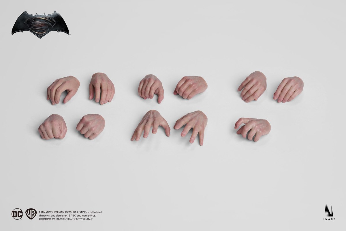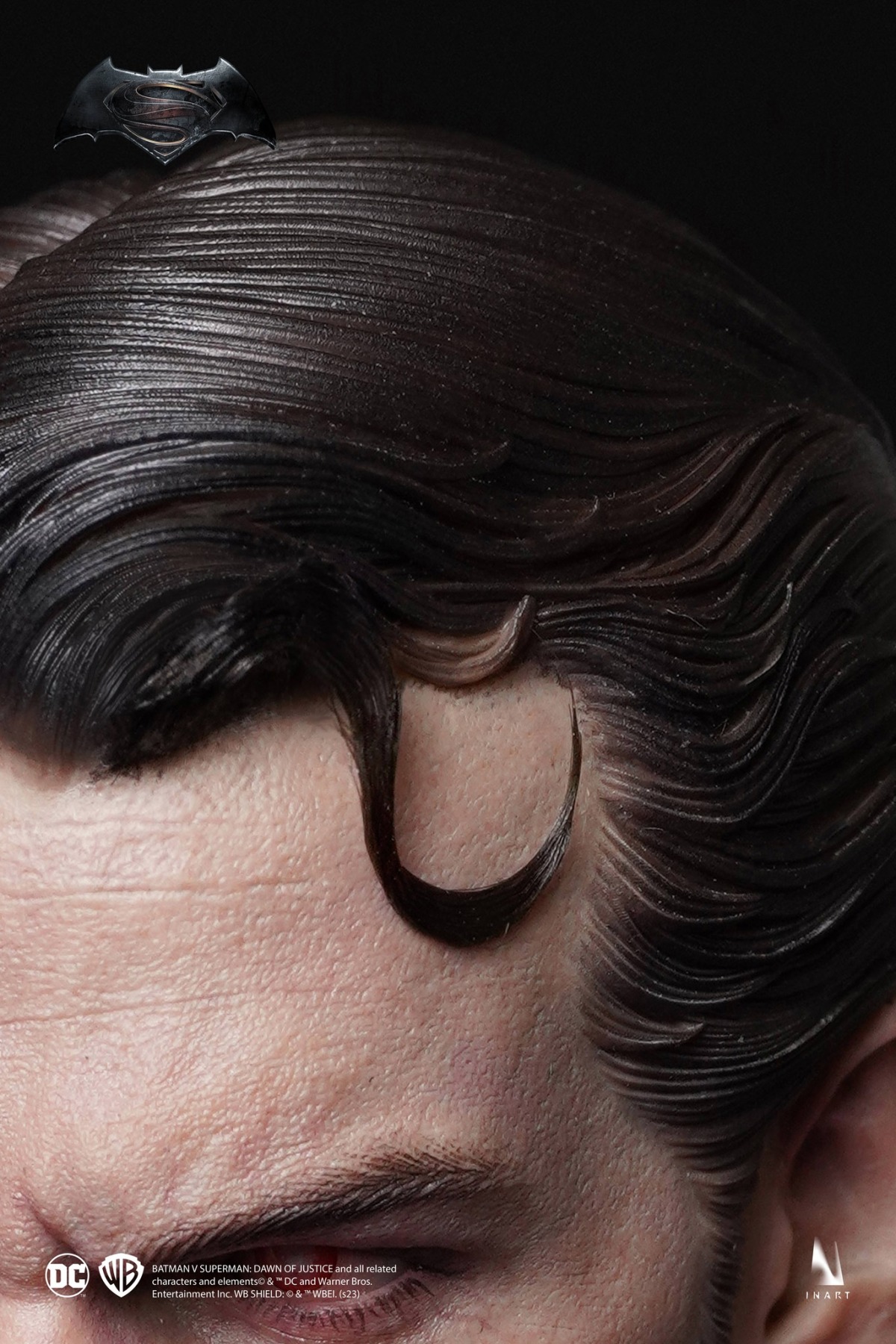 「INART 超人」採用樹脂、PVC、ABS、布料、羊毛、壓克力......等複合材料打造,依照 BVS 電影設定考究再現了各處的造型細節與演員「亨利·卡維爾」的劇中神韻,光是官圖呈現出來的頭雕表現就讓小編想以精美傑作來形容,從膚質紋理、面部輪廓、近乎真實人體的紅潤感,到整齊的油頭雕髮都相當出色,一般表情與憤怒狀態兩個頭雕也都有可動眼的設計。
