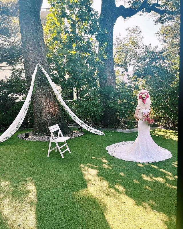 而這個「招牌雞頭」,也是始終未露面的板垣巴留代表之一,每次出席公開場合或是社群上的照片都會戴上這個,連個人頭像都使用這隻雞的插圖,粉絲也開玩笑巴留老師連婚紗都要戴上雞頭,可能比起老公這才是真愛 XD。