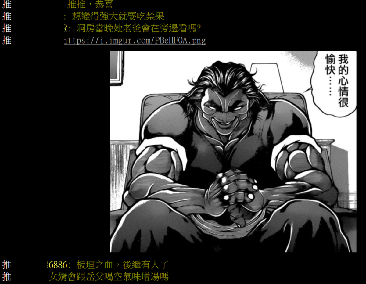 該消息傳到台灣後,在 PTT 的 C_Chat 版也出現了大量《刃牙》範馬勇次郎的梗圖,畢竟人家當初還在刃牙跟女友發生關係的時候在旁邊觀看,網友也開玩笑說 : 「洞房當晚她老爸會在旁邊看嗎? 」,還是得說聲恭喜吧 XD。