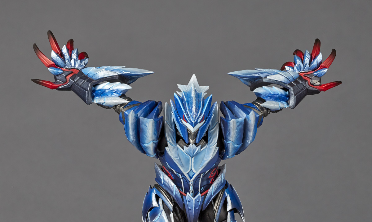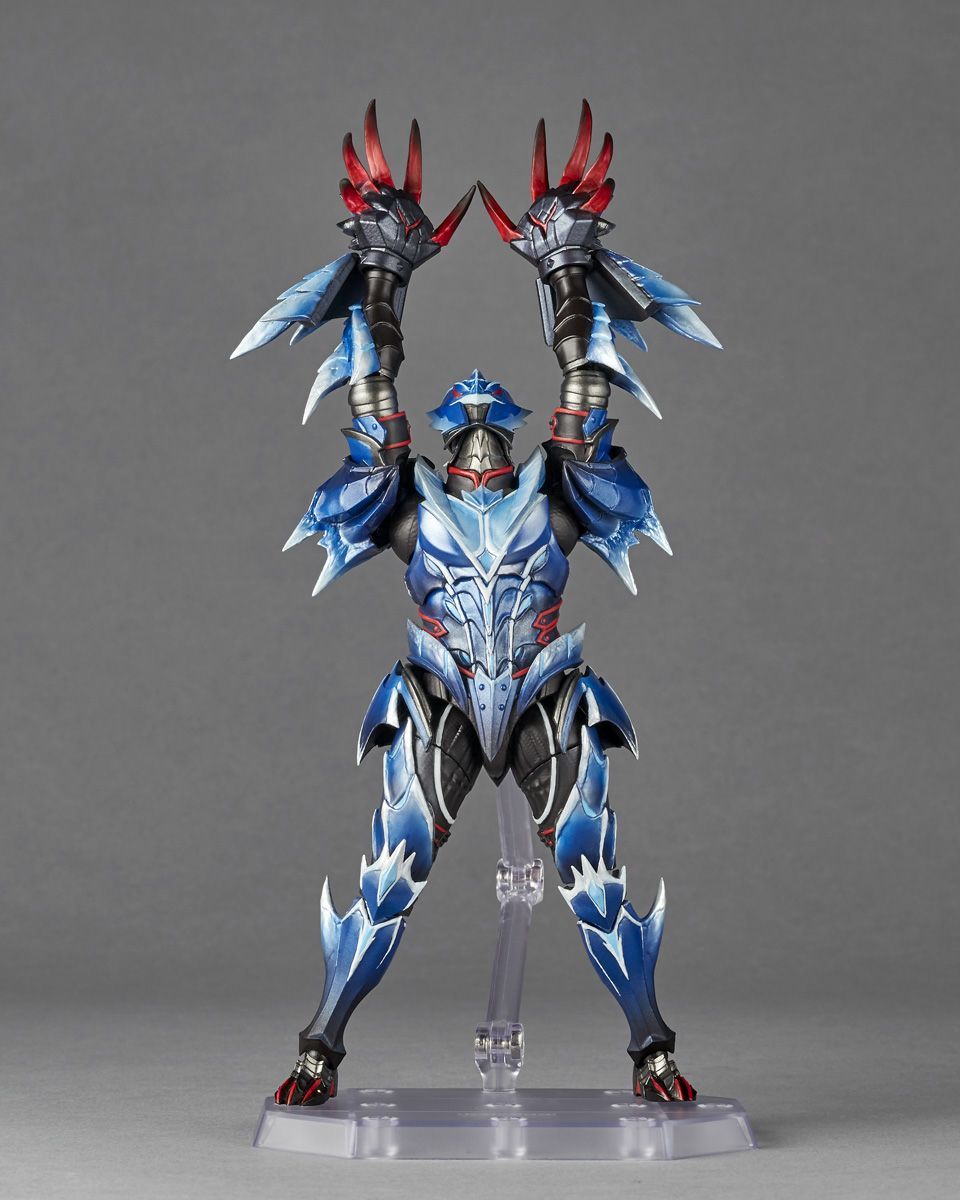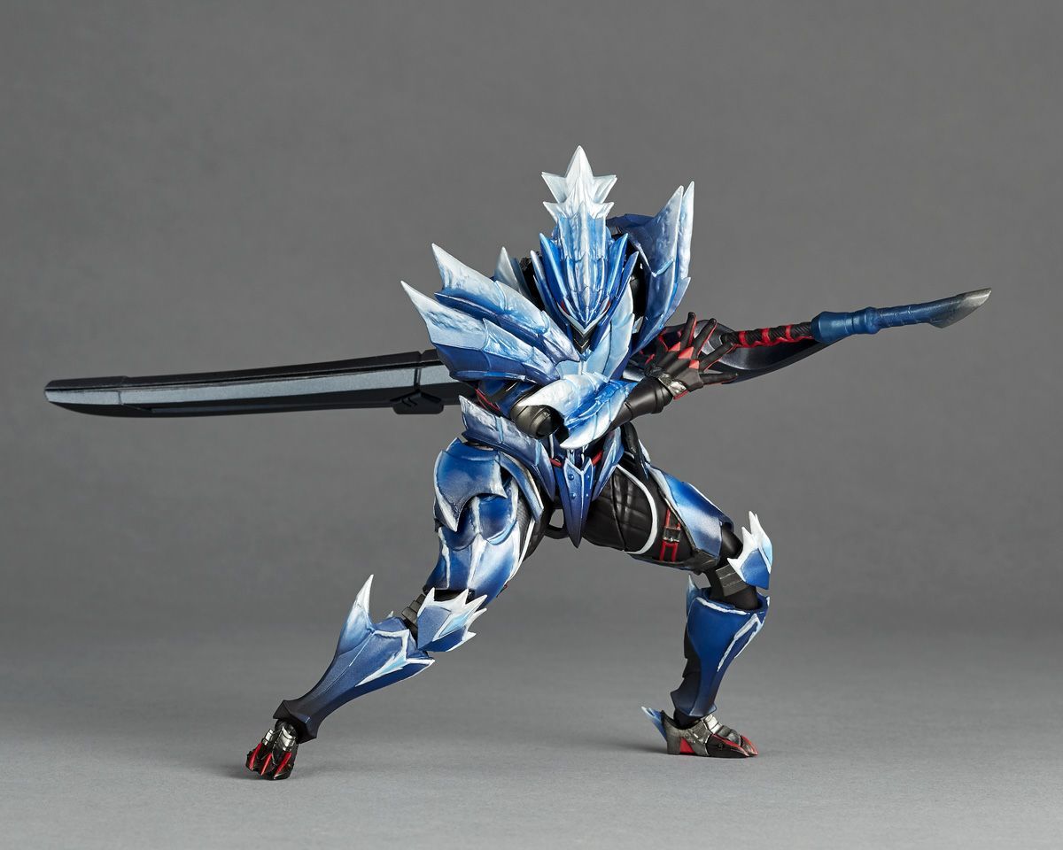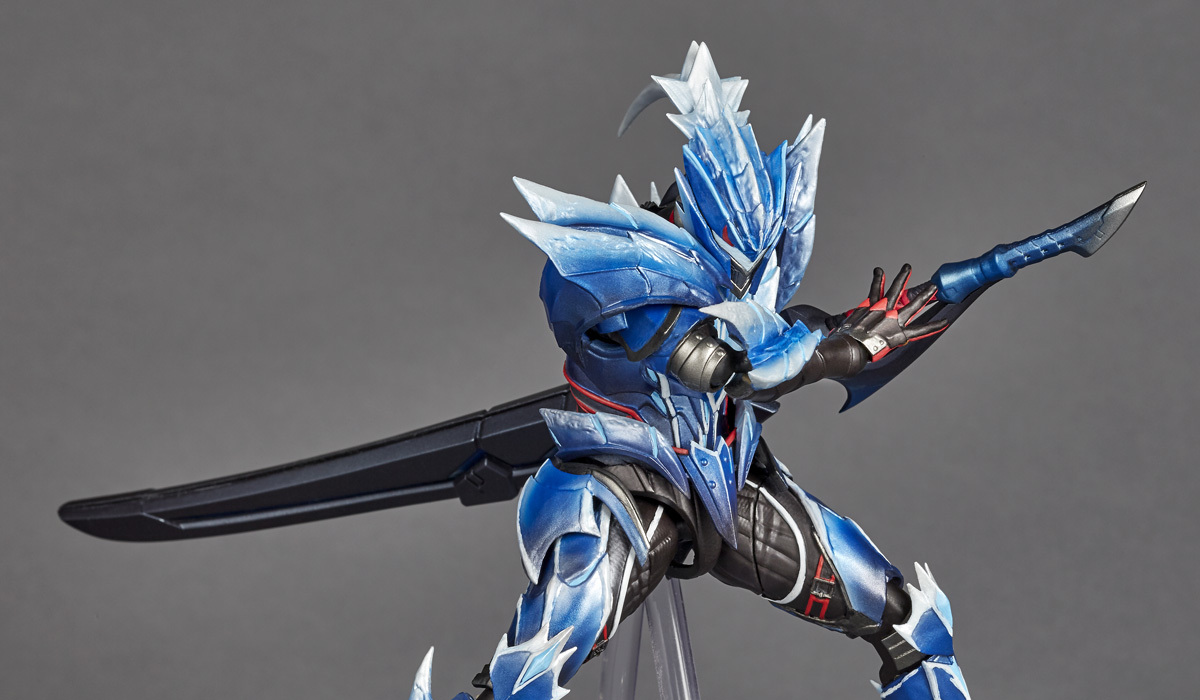 由海洋堂推出的這款冰狼龍系列裝備可動人形玩具,同樣由知名原型師山口勝久負責監修,全高約17公分,還原了遊戲中冰狼龍系列裝備的樣子,完整的面罩,以及帶些尖銳形狀包覆感完整的淺藍色鎧甲,帶些白色的紋路。透過山口大師的努力,讓可動性達至最佳。