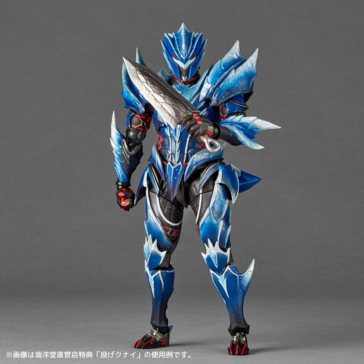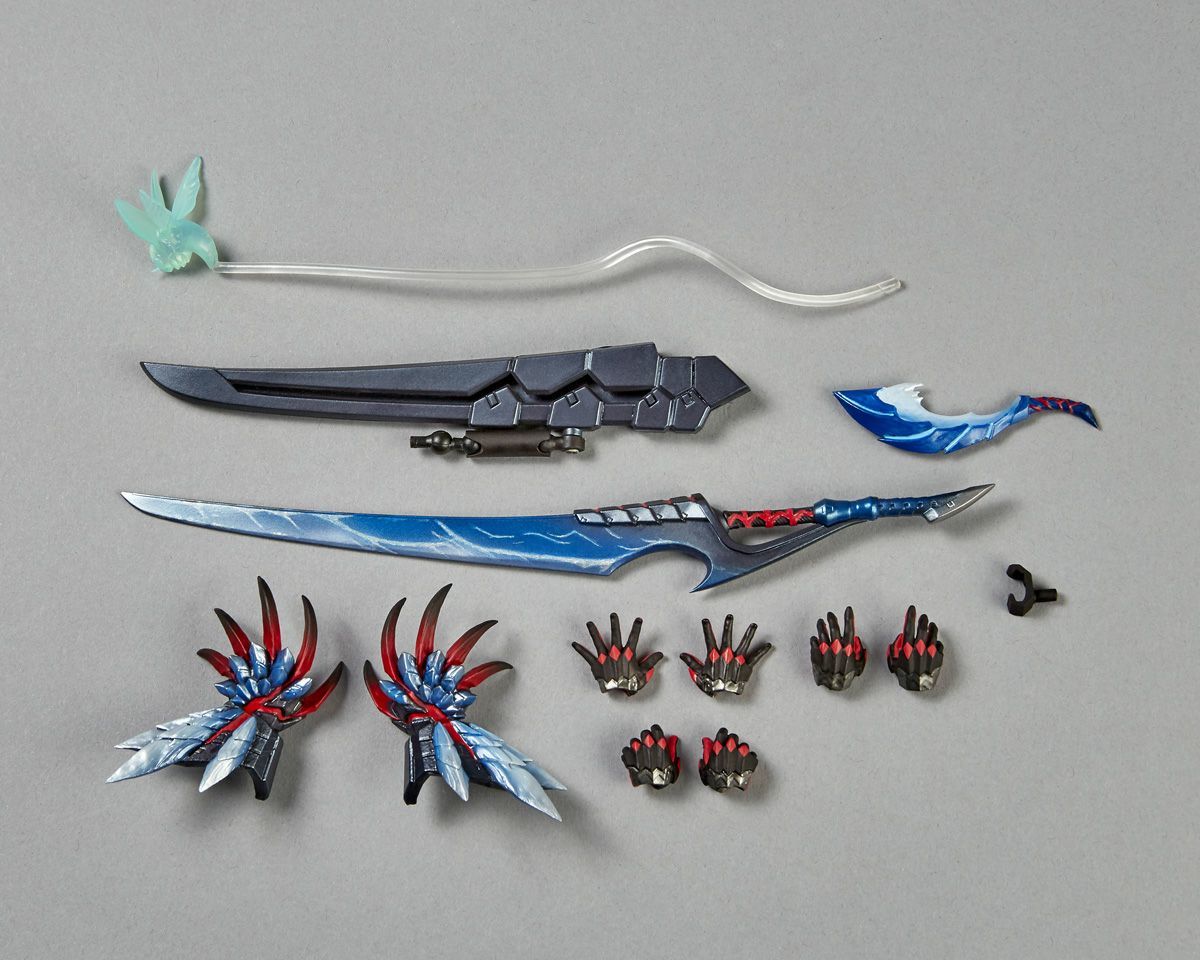 武器部分,有冰狼龍系列的雙劍「圓月冰輪爪」以及太刀「圓月冰輪刀」(包含刀鞘)兩種可以替換。特別是裝備雙劍之後,可以擺出各種用來移動的重要道具「翔蟲」配件與線材。三組可替換的手部配件,還有展示用台座。搭配系列本身優異的可動關節,各種出招狩獵動作都能輕鬆再現。本次在海洋堂直營線上商店預購可以獲得的特典為「投擲用苦無」與其線。