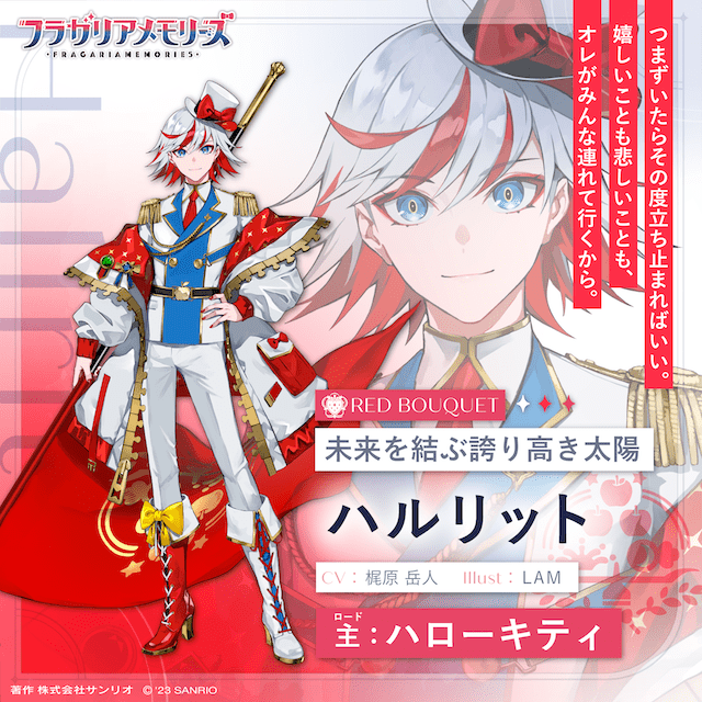 首波公開的就是這位稱作 ハルリット 的騎士,可以看到是以 Hello Kitty 為範本製作出來,還請到知名人氣繪師 LAM 設計,並確定由《咒術迴戰》灰原雄的聲優梶原岳人配音,看來三麗鷗這個企劃真的準備妥妥且認真。