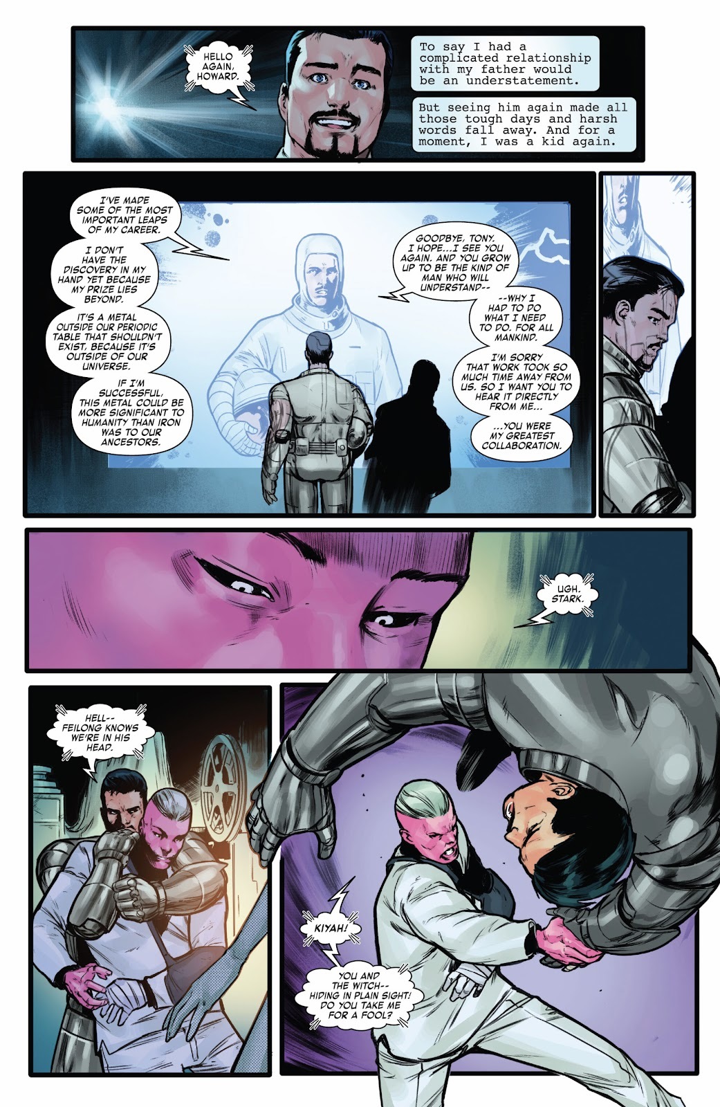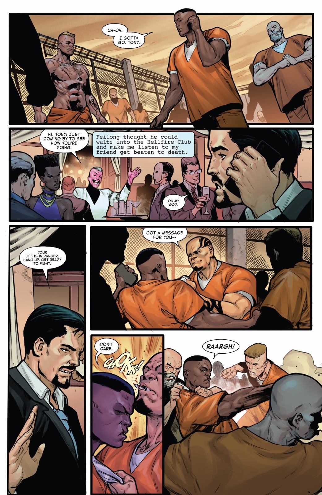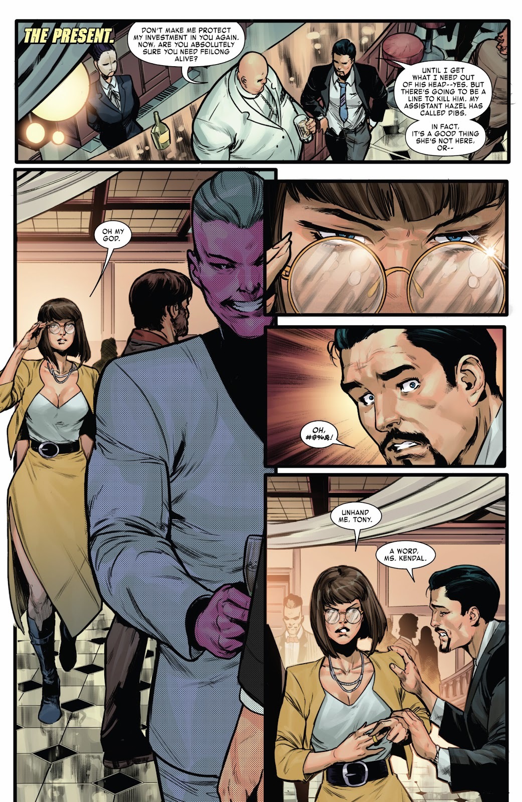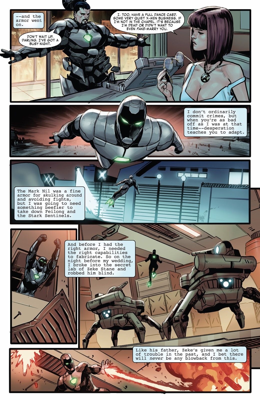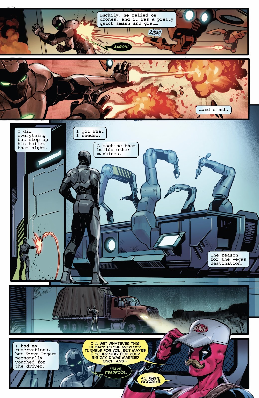 東尼用他目前僅剩的一套匿蹤裝甲潛入老反派Zeke Stane(鐵霸王Iron Monger的兒子)在附近的一間倉庫,搶走了一台自動化生產機械,因為他現在在地獄火俱樂部底下的設備實在太過原始。但是他要怎麼運走這東西?這時候居然找了目前是同盟一員的死侍來幫忙運載XD