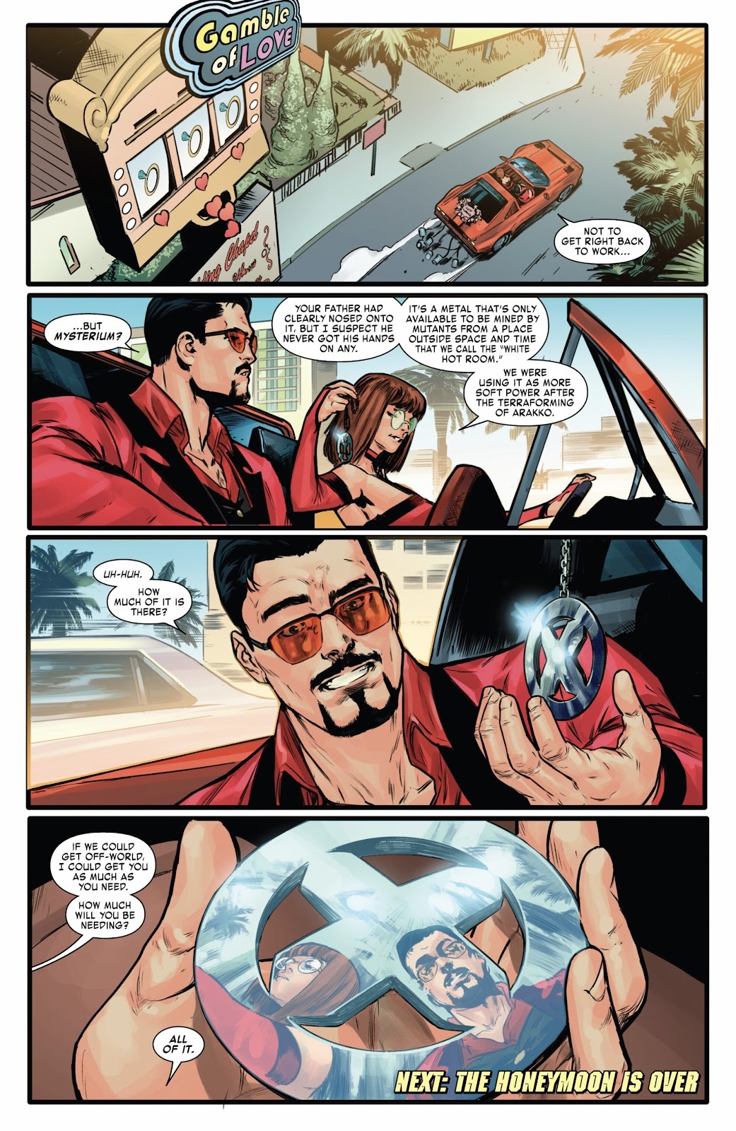 事情姑且算是完美收場。兩人現在要去度假的蜜月,實際上還有更多計畫要進行。其中之一,則是取得大量霍華曾發現的那種元素——基本上他曾發現的就是變種人自白熱室(White Hot Room)中取得的秘金屬(Mysterium),具有比瓦坎達汎金屬(Vibranium)更強大的物理性質,並且能夠阻斷魔法。