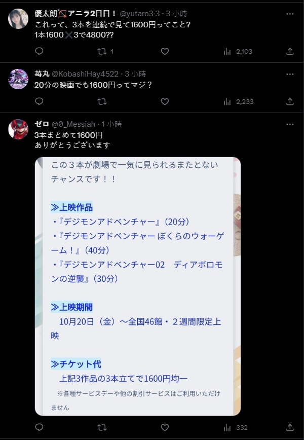 根據官方說明,將從2023年10月20日起,限定兩個禮拜的時間在日本全國46家指定戲院上映,而由於三部本身的片長皆不超過1個小時,因此票價方面,則是總共1600日圓,約新台幣340元左右。
