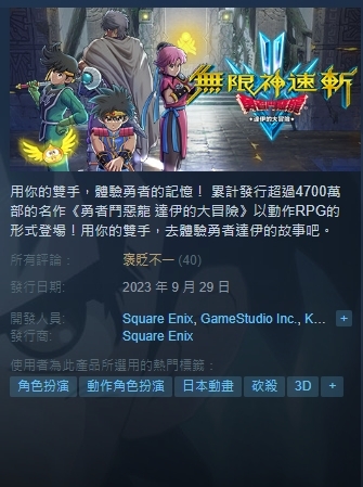 不過,至於《無限神速斬 勇者鬥惡龍 達伊的大冒險》發售後的評價又是如何呢?儘管Square Enix是以「慶祝」之意來發布影片,但對於玩家來說,這似乎並不是一件真的那麼值得慶祝的事情。