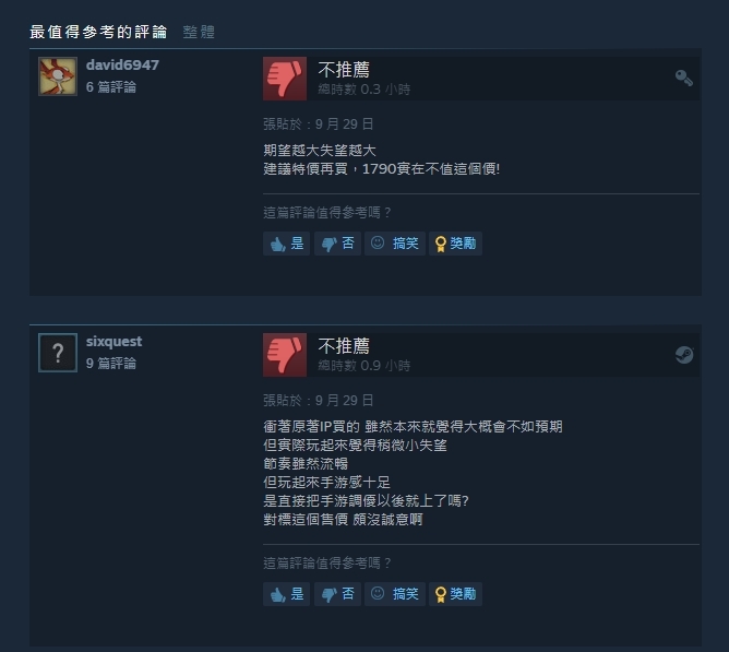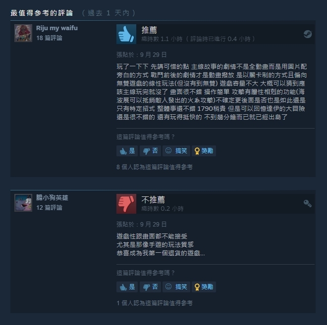 不僅是在影片留言底下,表示遊戲的故事、人物節奏呈現相當糟糕,在Steam評論上更是顯示「褒貶不一」,主線故事劇情不僅並非以全動畫,而是以圖片配旁白的形式呈現,畫面呈現上更是如同手遊一般的質感,讓玩家因此憤而退款,給下負評。