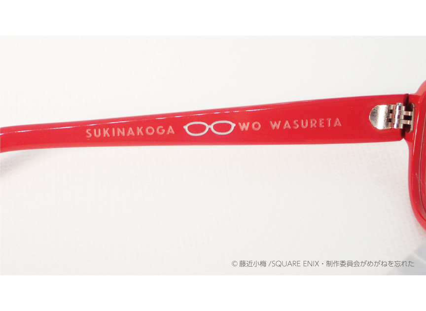 設計完全參照動畫中三重愛的眼鏡款式,紅色粗框的樣式,左鏡腿內側也印有動畫的英文字樣。