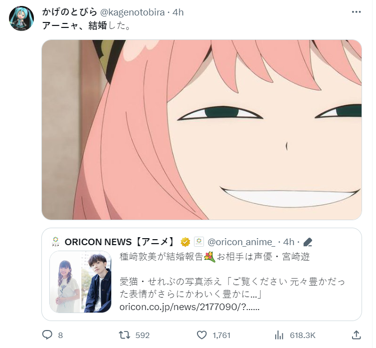 也恭喜同為聲優的種崎敦美與宮崎遊兩人結婚,祝福之後兩人工作上也能順利保持下去,安妮亞喜當人妻囉 XD。